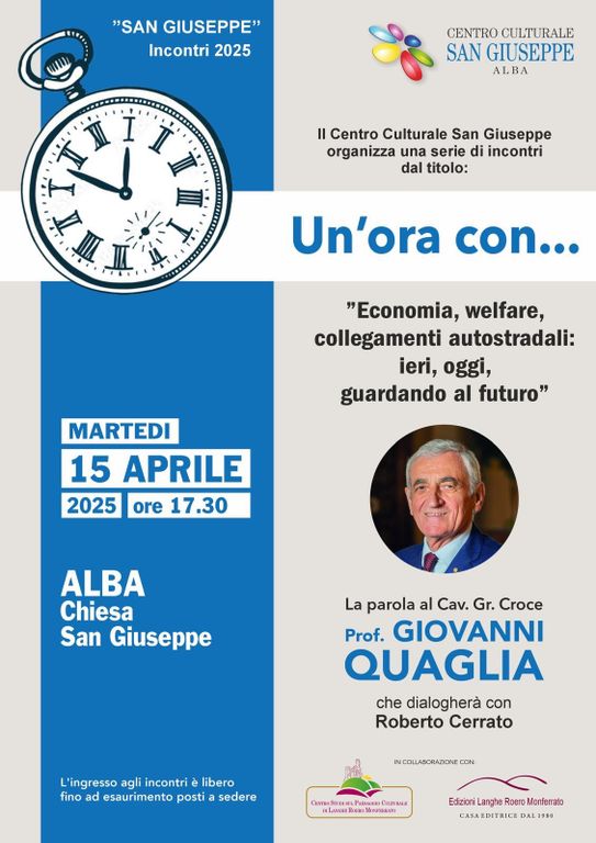 Martedì 15 aprile 2025, alle ore 17:30, presso la Chiesa di San Giuseppe di Alba, si terrà un importante incontro pubblico con il Prof. Giovanni Quaglia, protagonista del nuovo appuntamento del ciclo “San Giuseppe Incontri 2025”, promosso dal Centro Culturale San Giuseppe.