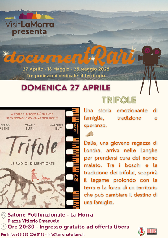Tre appuntamenti – il 27 aprile, il 18 maggio e il 25 maggio – offriranno al pubblico la possibilità di riscoprire paesaggi, tradizioni e storie autentiche, legate a quei luoghi e a quelle persone che ogni giorno si lasciano ispirare dalla bellezza che li circonda. Tutte le proiezioni si terranno alle ore 20:30 presso il Salone Polifunzionale di La Morra, con ingresso gratuito ad offerta libera.