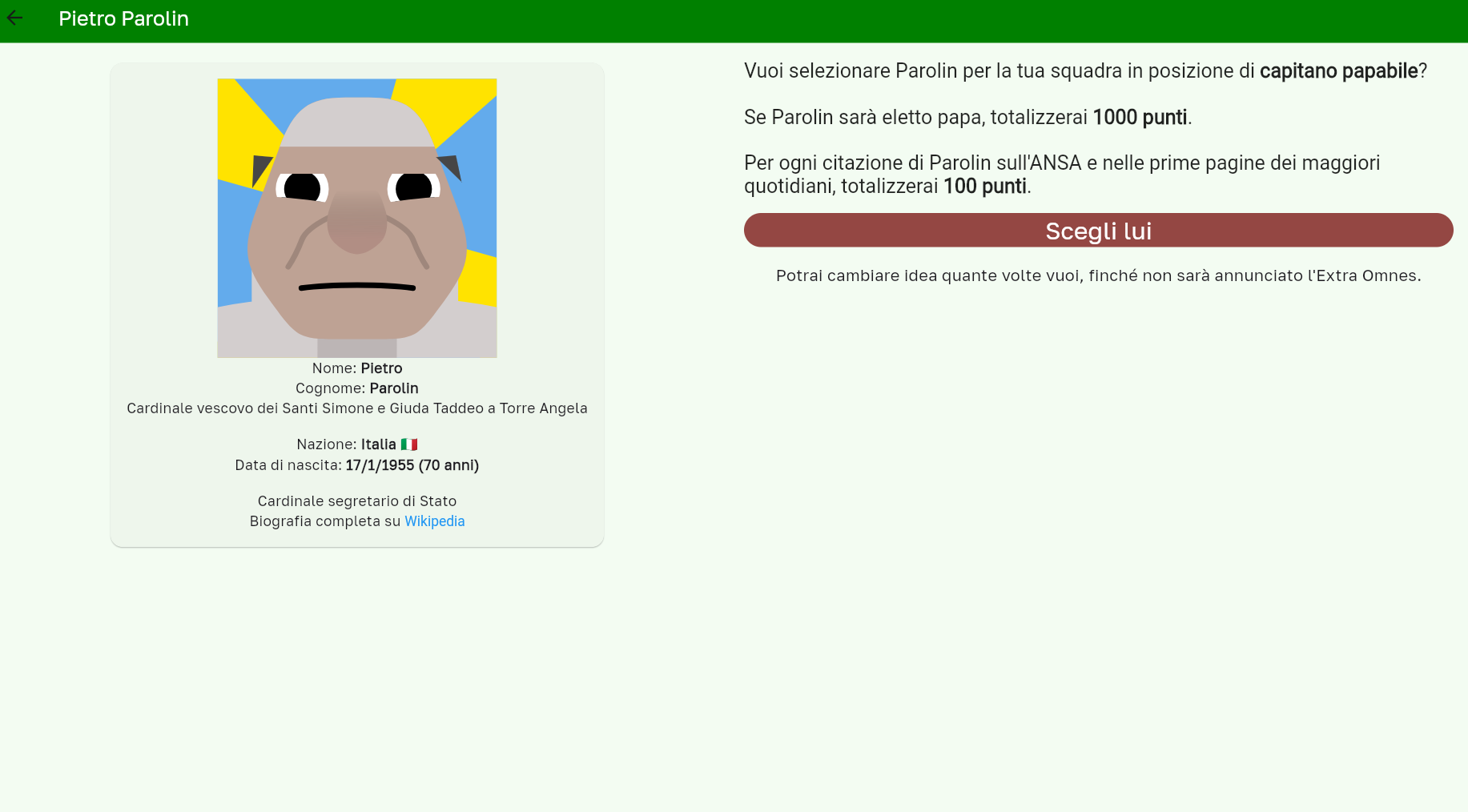 [La scheda del cardinal Parolin, Segretario di Stato vaticano indicato tra i probabili successori di Francesco - Screenshot tratto da portale Fantapapa]