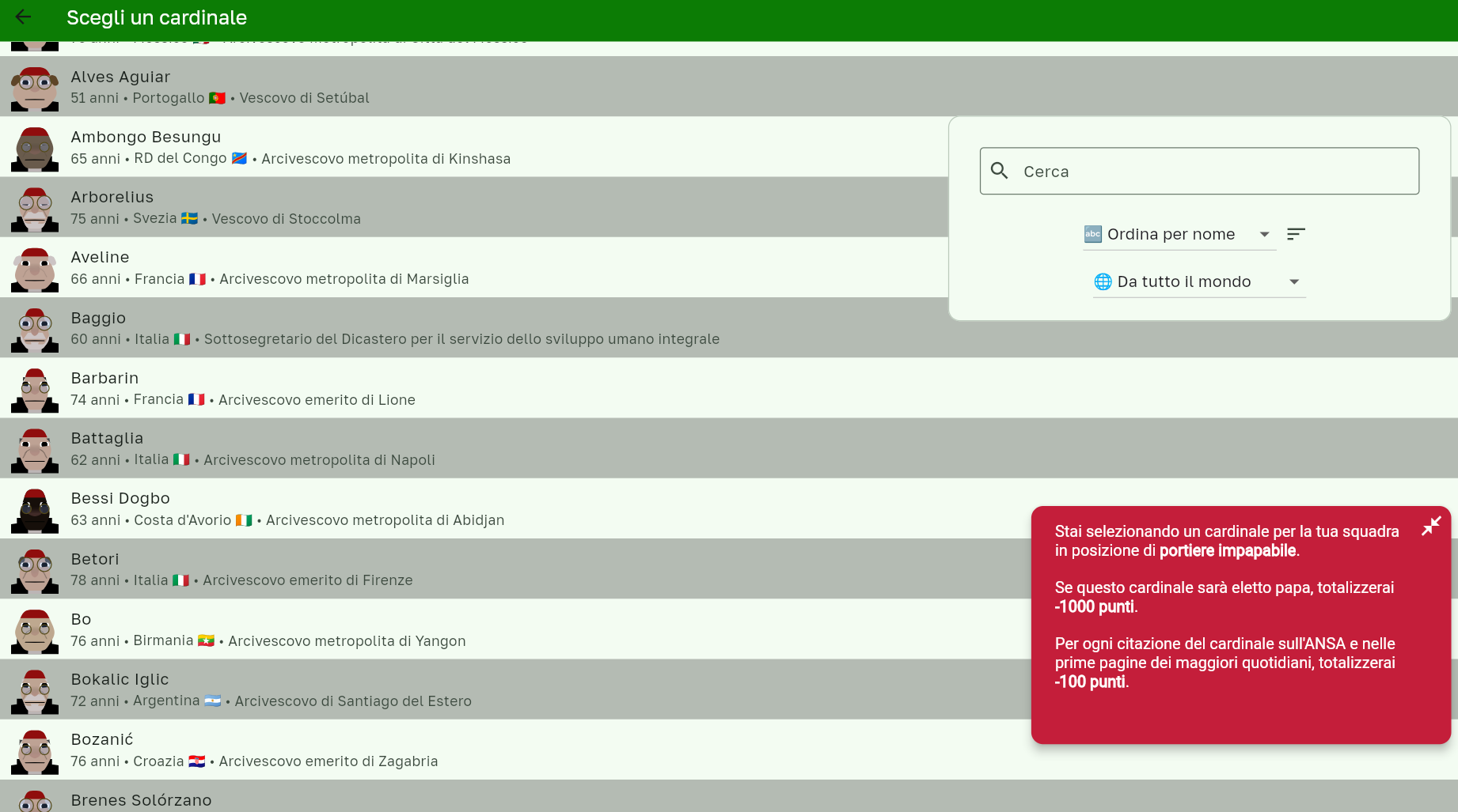 [L'elenco di tutti i cardinali che prenderanno parte al conclave, con le rispettive schede - Screenshot tratto dal portale Fantapapa]