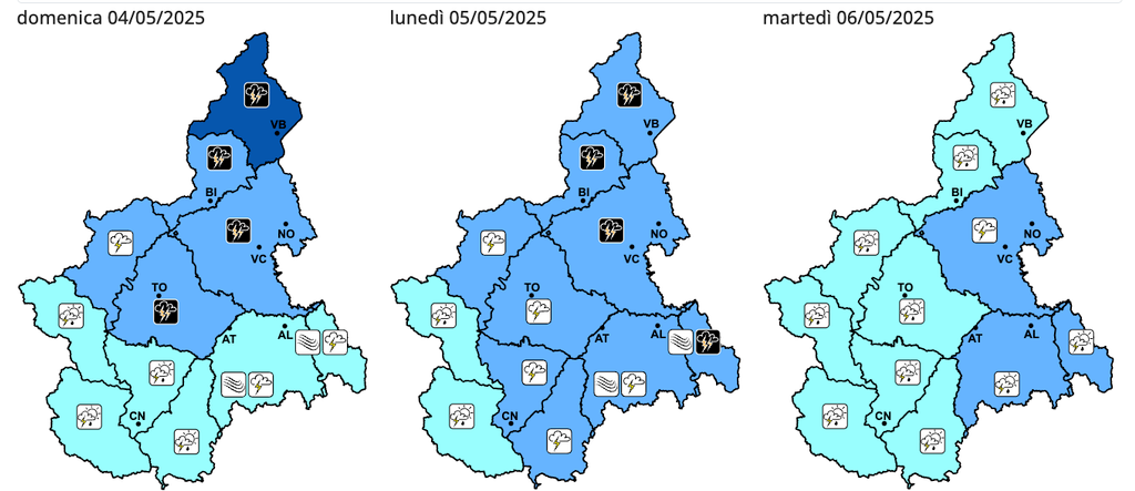 La stessa agenzia scriveva ieri che "nella giornata di domani, una vasta area di bassa pressione situata sull’Europa settentrionale inizia a espandersi verso sud, avvicinandosi al Nord Italia. Questo movimento porta a un progressivo calo della pressione in quota, anche se la depressione rimane ancora abbastanza distante da determinare effetti meteorologici particolarmente significativi. Tuttavia, a partire da domani pomeriggio (domenica, ndr), l’area depressionaria raggiungerà l’arco alpino, causando un marcato peggioramento del tempo sul Piemonte. In particolare, i primi rovesci e locali temporali sono attesi dalle ore centrali di domani (oggi, ndr) a partire dai rilievi alpini, in rapida estensione alle zone di pianura nel corso del pomeriggio e in intensificazione con valori moderati o forti. Le pianure a Nord del Po e le aree settentrionali al confine con la Lombardia sono le zone in cui si prevedono i fenomeni più intensi e persistenti, dove non si escludono locali grandinate, fulminazioni e raffiche di vento".