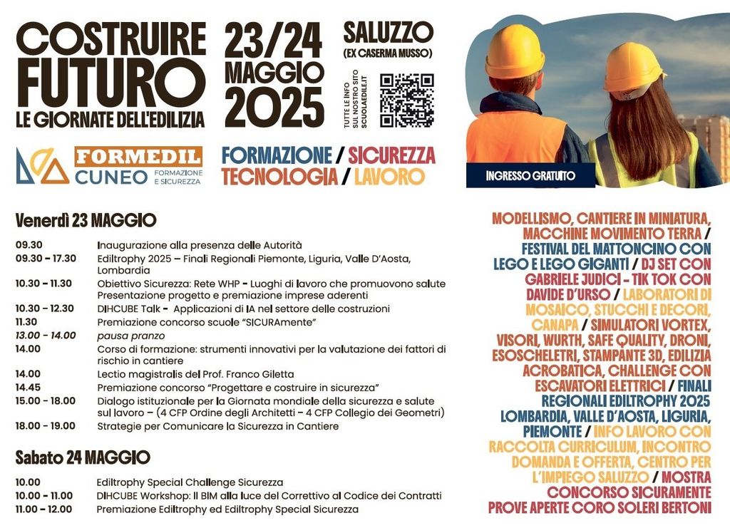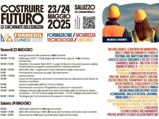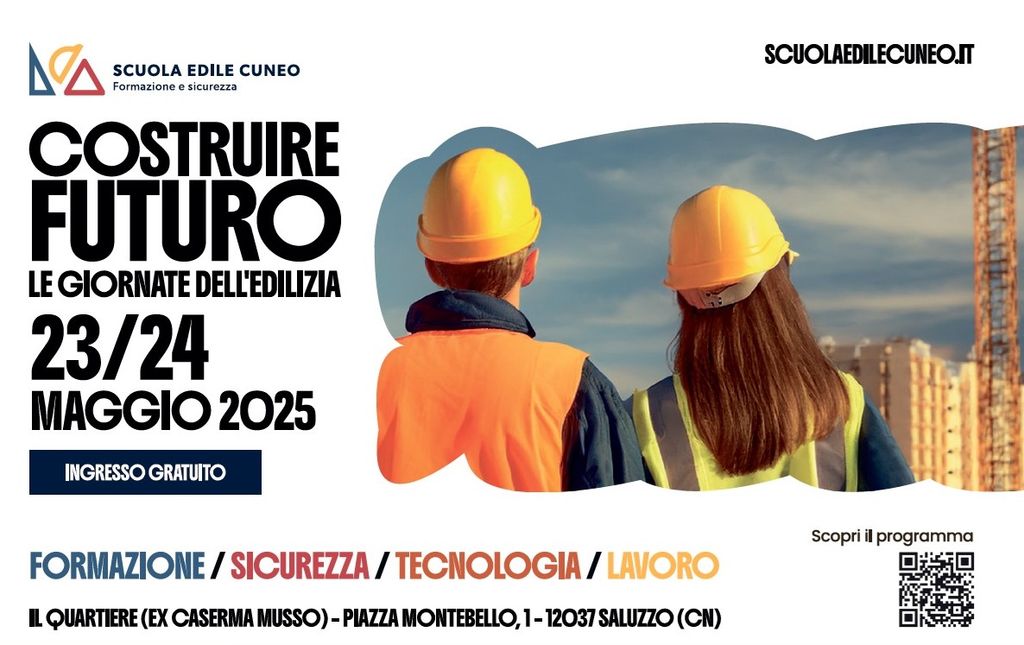 Venerdì 23 e sabato 24 maggio la Scuola Edile di Cuneo organizza due giornate dell’edilizia a Saluzzo dal titolo “Costruire futuro”, una manifestazione, ad ingresso gratuito e aperta a tutti, promossa con il patrocinio di Formedil, Ministero dell’Istruzione, Regione, Provincia, Confindustria, Confartigianato, Cassa Edile, Asl e altre diverse realtà locali.