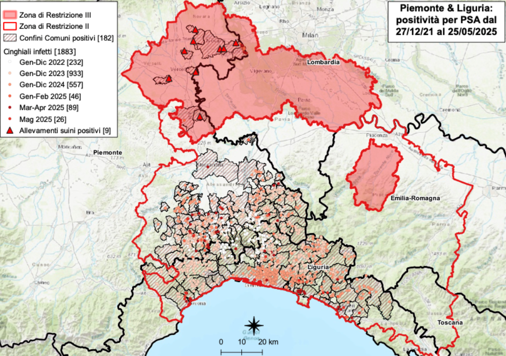 Dei nuovi casi, uno è rilevato in Piemonte, a Morbello, nell’Alessandrino. Il totale dei casi in regione sale così a 784 casi. Non si segnalano, però, nuovi focolai in allevamenti suinicoli.
