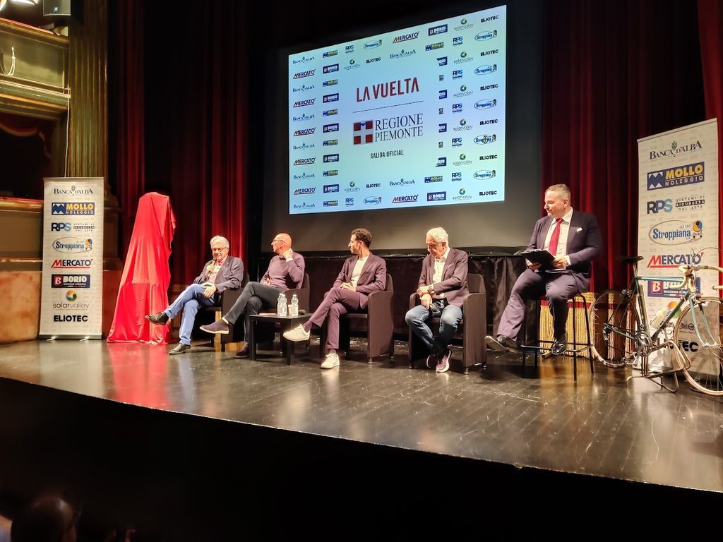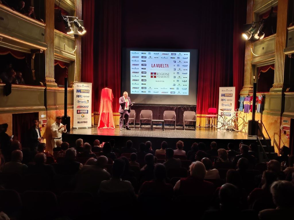 Ala storica del Teatro Sociale “G. Busca” di Alba gremita di pubblico ieri, mercoledì 4 giugno, per la serata evento speciale di presentazione della tappa Alba-Limone Piemonte della Vuelta di Spagna, che quest’anno partirà dal Piemonte, dove si correranno, a partire dal 23 agosto, ben 4 tappe.