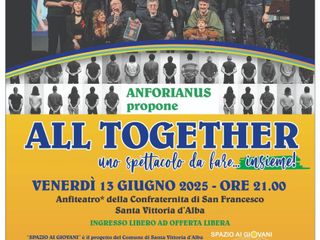 “All Together - Uno spettacolo da fare insieme!", in programma per il 13 giugno 2025 a Santa Vittoria d'Alba, promosso dall'Associazione Anforianus Odv con il patrocinio del Comune di Santa Vittoria d’Alba e la collaborazione della Pro Loco Santa Vittoria d’Alba e della Proloco Cinzano 91APS, con il prezioso sostegno del “CSV Società Solidale” di Cuneo, rappresenta non solo un’occasione di svago, ma un’esperienza educativa e formativa. Il coinvolgimento degli artisti volontari del gruppo “Tut a Post” e la partecipazione di ragazzi e famiglie dimostrano quanto la passione, la gratuità e il desiderio di creare connessioni umane possano generare bellezza e ispirazione. Iniziative di questo tipo meritano di essere sostenute e replicate, perché contribuiscono a costruire una società più coesa, creativa e solidale.