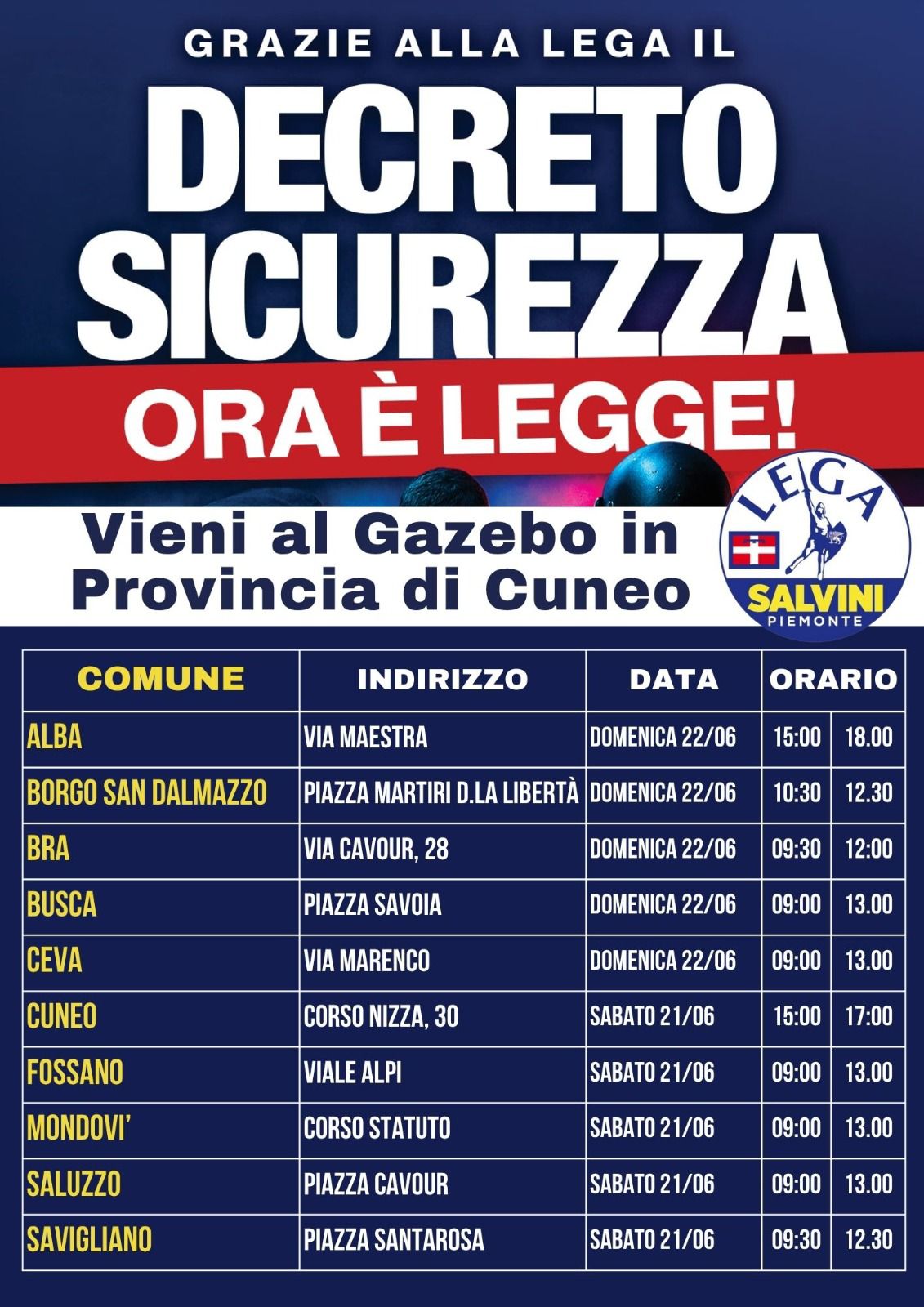 La Lega scende in piazza per informare i cittadini sulle importanti novità introdotte dal Decreto Legge 11 aprile 2025, n. 48, il cosiddetto "Decreto Sicurezza", finalmente legge grazie al lavoro e alla determinazione del partito guidato dal Vicepremier Matteo Salvini. Questo fine settimana, sabato 21 e domenica 22 giugno, saranno allestiti numerosi gazebo in diverse città e paesi della provincia di Cuneo, per offrire ai cittadini l'opportunità di approfondire i contenuti del provvedimento.