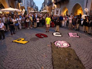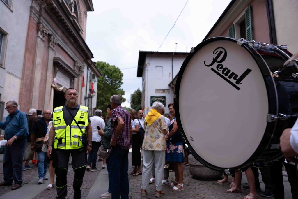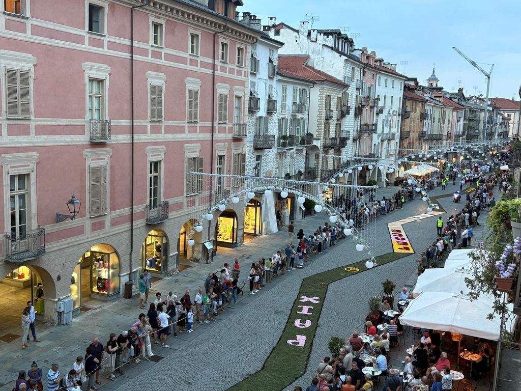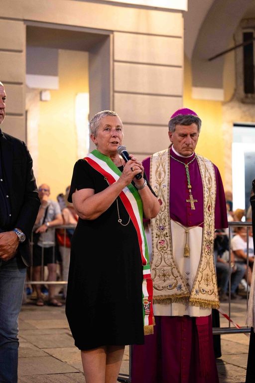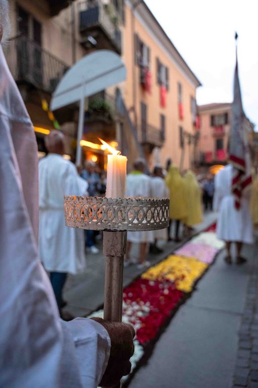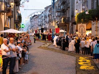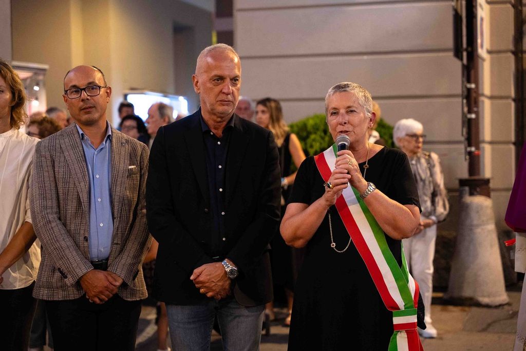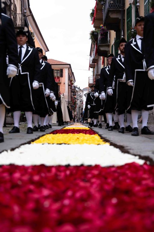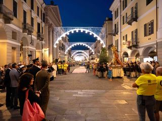 La statua della Madonna ha attraversato via Roma e si è fermata in piazza Galimberti, dove è stato reso omaggio dalle autorità civili e religiose. Al passaggio, dai balconi addobbati con drappi rossi sono stati lanciati petali di rosa sul corteo, simbolo di devozione e partecipazione popolare.