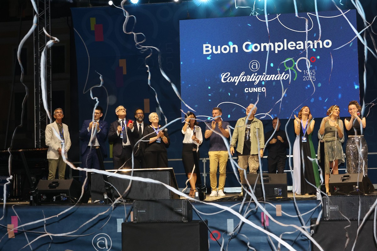 A concludere la serata, un simbolico momento corale con tutti gli ospiti e gli artisti riuniti sul palco insieme a Luca Crosetto, Joseph Meineri, Daniela Balestra (vice presidente vicaria di Confartigianato Cuneo) e Michele Quaglia (vice presidente di Confartigianato Cuneo). Un "Buon Compleanno" speciale, scandito da un'esplosione di coriandoli e applausi, ha concluso una serata che resterà nella memoria della città.