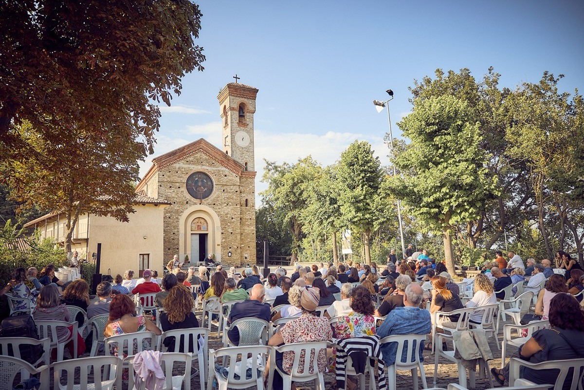 Dal debutto del 5 luglio fino all’ultimo appuntamento del 13, Olimpia ha trasformato borghi e sentieri in gallerie a cielo aperto, intrecciando parole, sculture, immagini e suoni con la natura e le persone. Il reading-spettacolo 1984 con Giuseppe Culicchia e Giorgio Li Calzi, andato in scena domenica 13 a San Bovo di Castino (nella foto sotto), ha segnato uno dei momenti più significativi dell’intera rassegna, grazie alla potenza del testo orwelliano e alla forza evocativa del luogo, tra colline e silenzi.