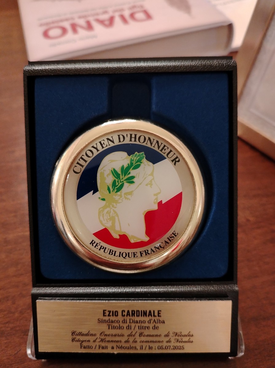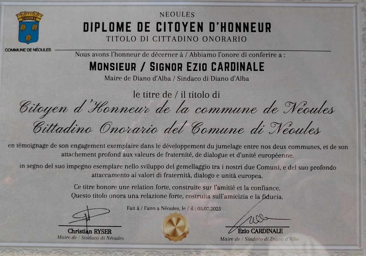 La voce tradisce ancora un’emozione fresca, quasi incredula. Ma le parole, anche quando si cerca di contenerle, trovano la loro strada. “La frustrazione più grande è non riuscire a esprimere con le parole, scritte o pronunciate, ciò che provo. Quantomeno grazie, riesco a dirlo, grazie per avermi regalato uno dei momenti più belli della mia vita”. Così Ezio Cardinale, sindaco di Diano d’Alba, ha commentato il conferimento del titolo di Cittadino Onorario di Néoules, comune francese situato nella regione della Provenza-Alpi-Costa Azzurra.