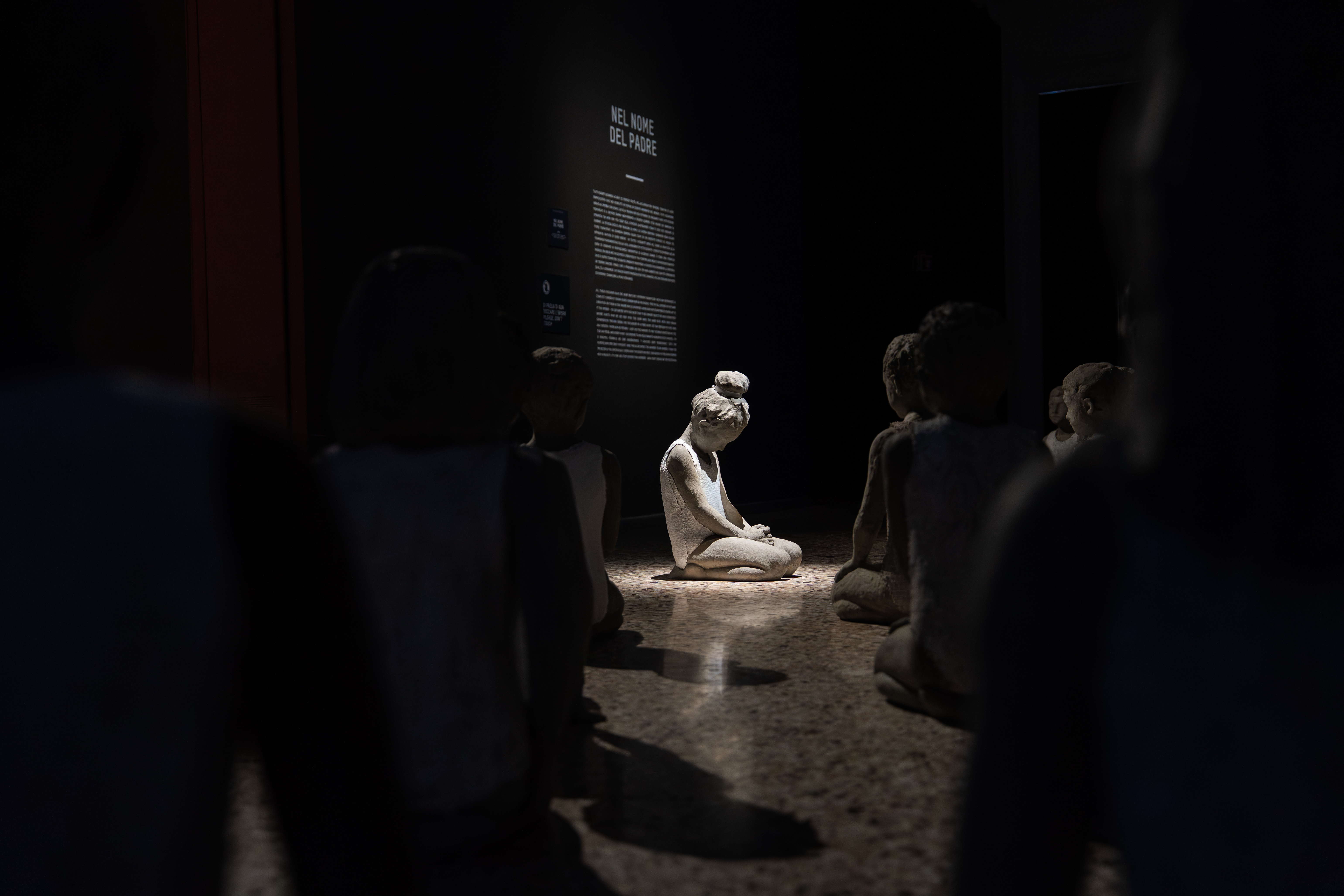 È l’infanzia – sospesa, luminosa, essenziale – a muovere le due tappe che in questo scorcio d’estate raccontano la sua visione: dal Palazzo Reale di Milano, dove la mostra More than kids è visitabile fino al 2 novembre, alla banchina nord del porto canale di Cervia, dove l’8 agosto si accenderà la monumentale sirena in bronzo Non basta il canto delle sirene. Due opere diverse, ma una sola origine: le Langhe, che non vengono mai rappresentate direttamente, ma sono sottese a ogni immagine, con la loro luce e la loro dolcezza silenziosa.