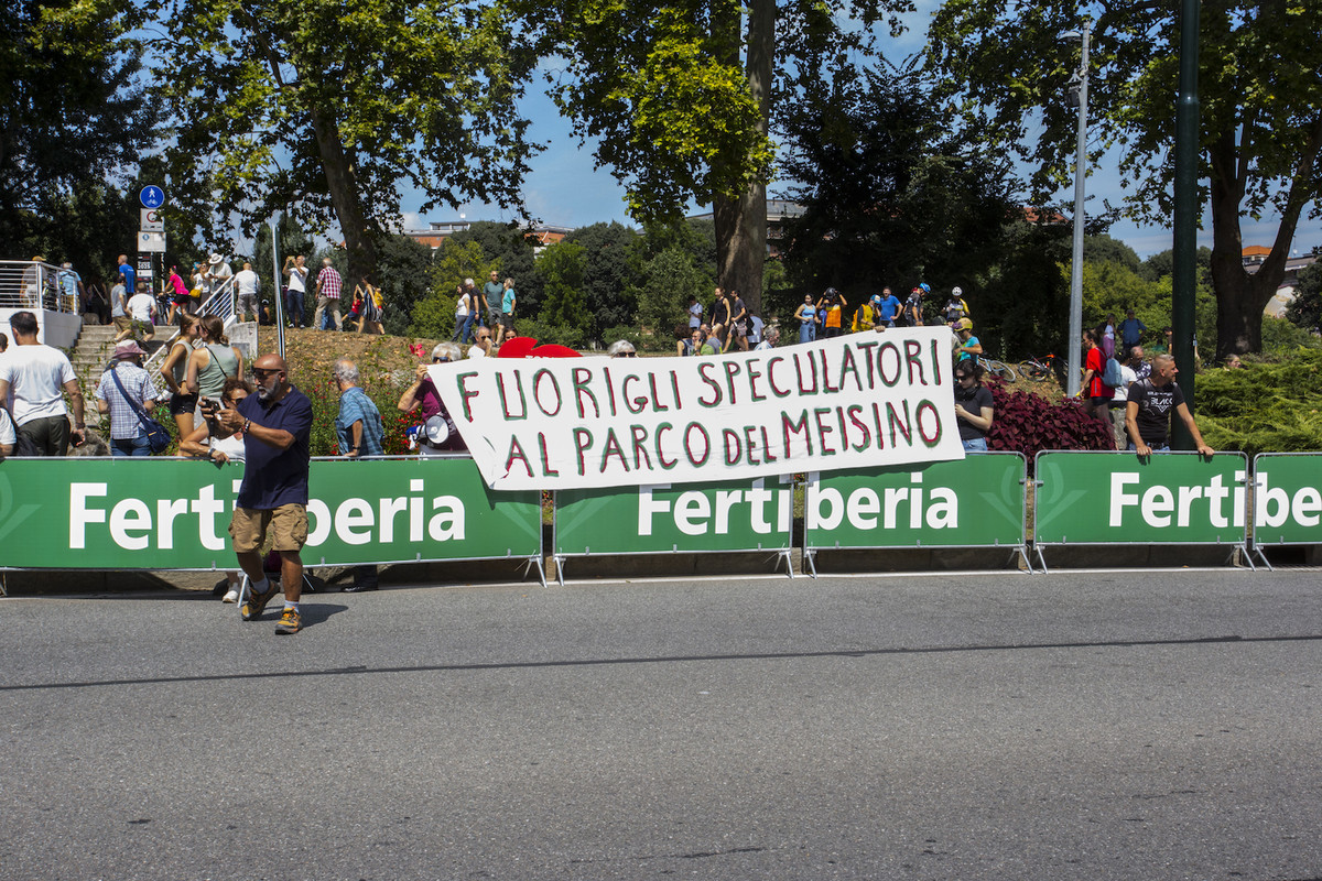 “Fuori gli speculatori dal Parco del Meisino” e una bandiera della Palestina sono stati alzati durante il passaggio.