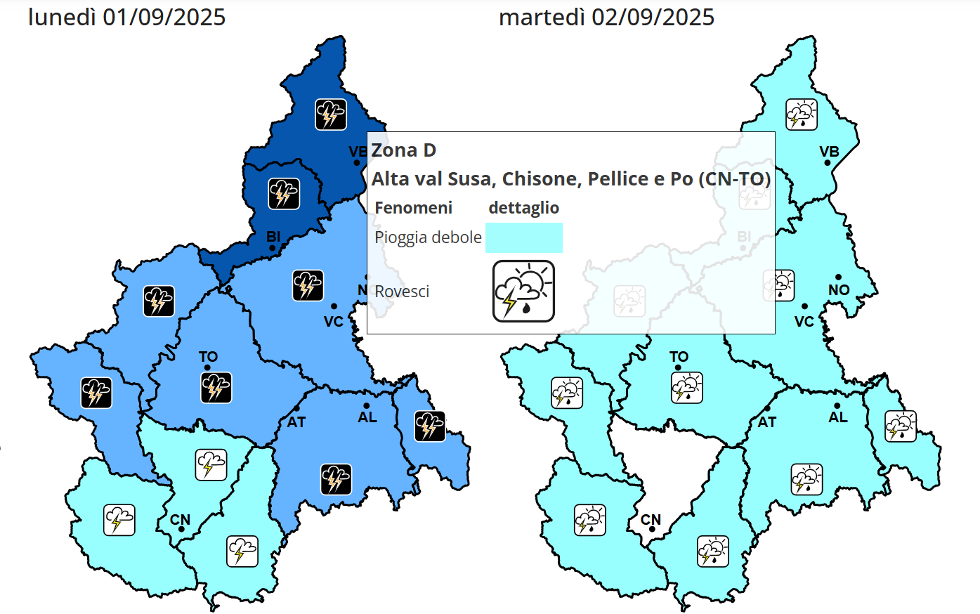 Oggi, invece, ancora giornata in prevalenza soleggiata. Il peggioramento è annunciato dall'Agenzia Regionale per la Protezione Ambientale a partire da domani, con precipitazioni diffuse su tutta la regione a eccezione proprio del Cuneese. I fenomeni più intensi sono attesi nella seconda parte della giornata, soprattutto sul Piemonte centro-orientale, sul Verbano e al confine con la Liguria. Temperature in diminuzione.