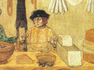 Le origini della Fontina sono davvero antiche, come testimoniano alcuni affreschi dei castelli medievali che sorvegliano la Valle d’Aosta. In una delle raffigurazioni che decorano quello di Issogne, tra i più colorati e meglio preservati, ci sono due uomini dietro al banco di una bottega piena di salumi e formaggi. Alla loro sinistra troneggiano delle forme quasi identiche a quelle della Fontina di oggi.