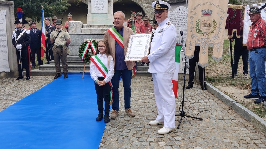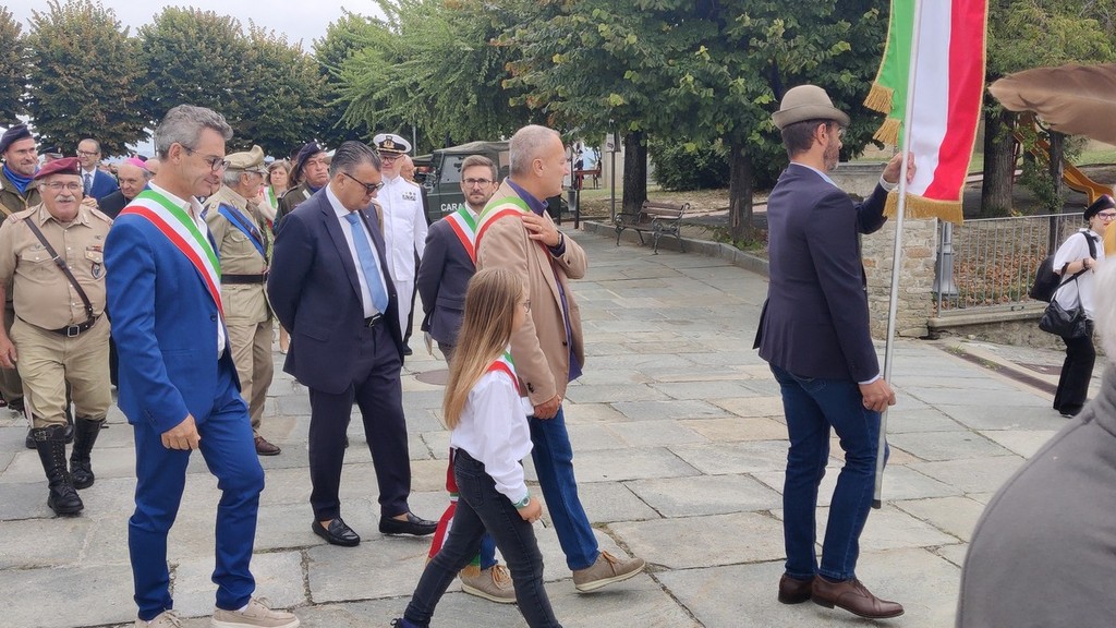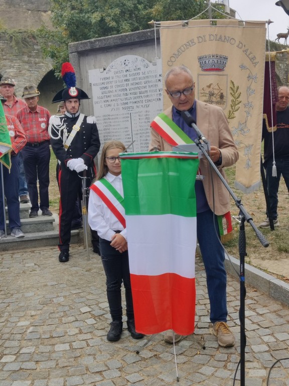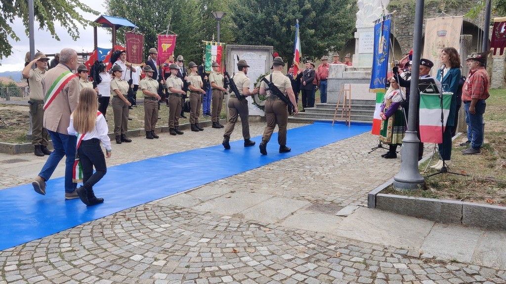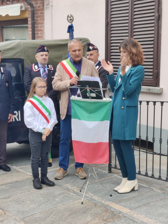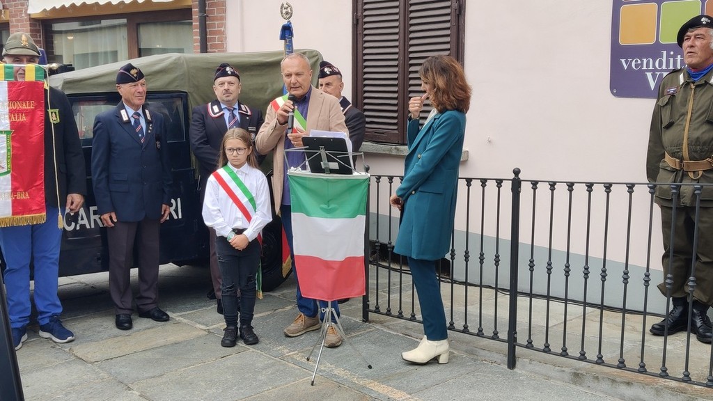 Accompagnata dalla fanfara dell’Aeronautica Militare, accanto al picchetto d’onore del 2° Reggimento Alpini di Cuneo, la prima parte del cerimoniale ha visto la deposizione di una corona di alloro al Monumento dei Caduti da parte del primo cittadino e della piccola sindaca dei ragazzi Gloria Proglio.