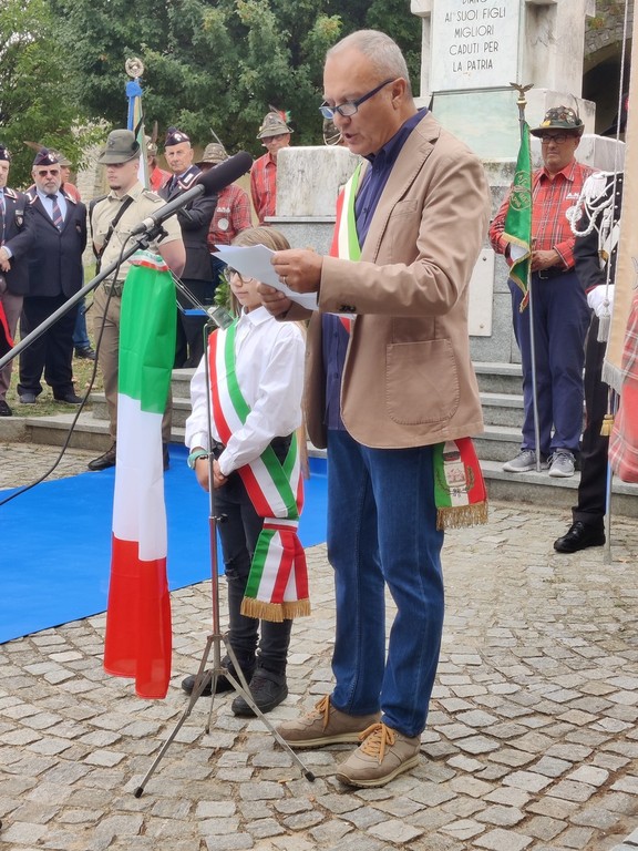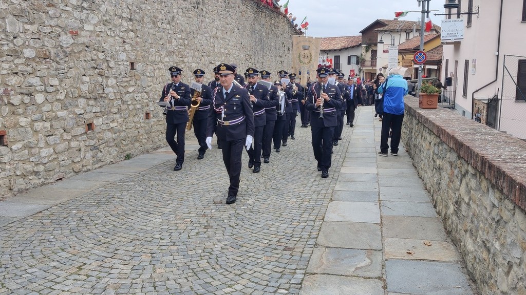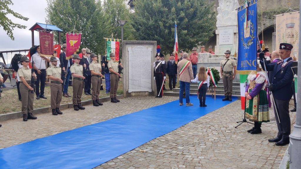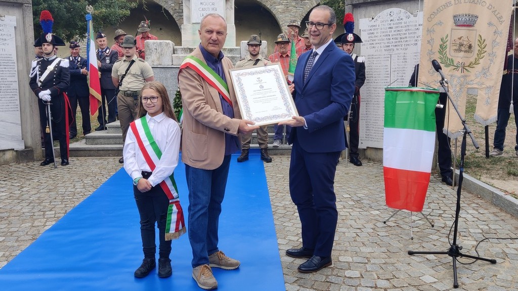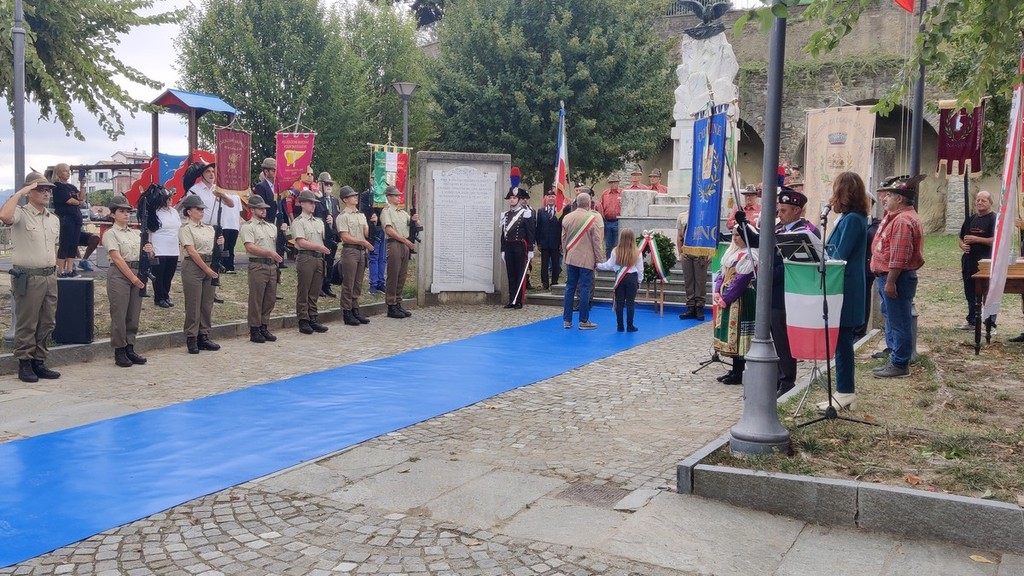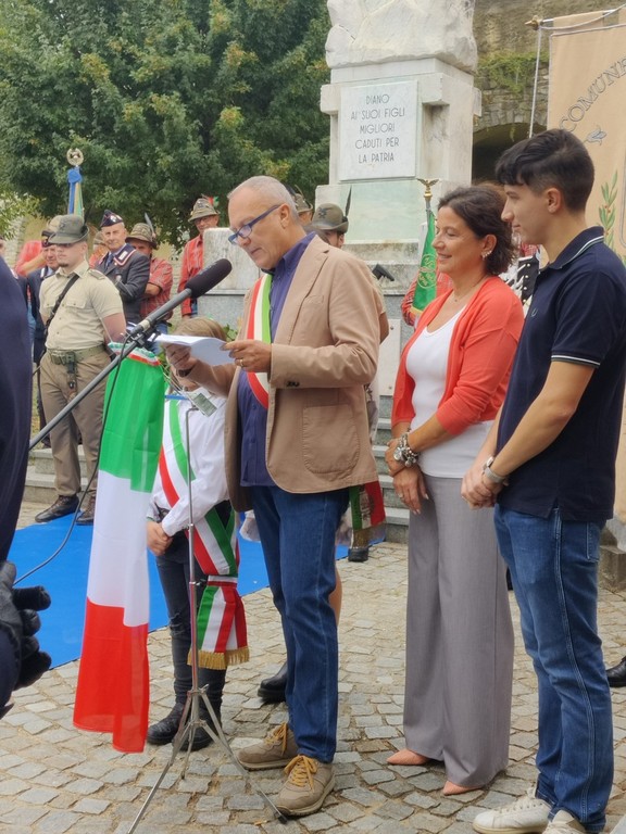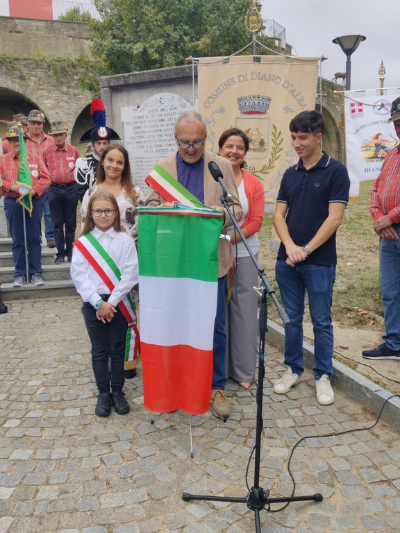 Accompagnata dalla fanfara dell’Aeronautica Militare, accanto al picchetto d’onore del 2° Reggimento Alpini di Cuneo, la prima parte del cerimoniale ha visto la deposizione di una corona di alloro al Monumento dei Caduti da parte del primo cittadino e della piccola sindaca dei ragazzi Gloria Proglio.