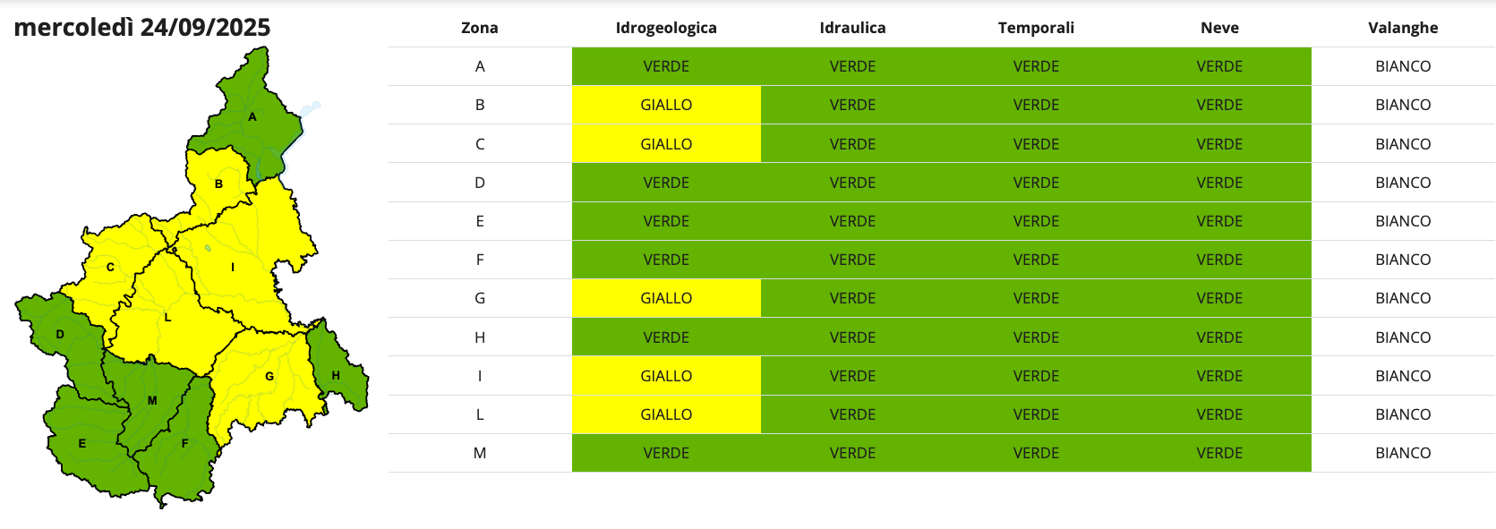Esclusa, rispetto a ieri, la Valle Po, mentre analogo livello di attenzione è prescritto per domani, mercoledì 24.