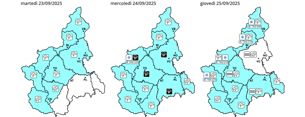 "Locali allagamenti e isolati fenomeni di versante" è la previsione contemplata per le zone di pianura tra Alessandrino, Astigiano e settori alpini nordoccidentali (zone B,C, G, I ed L). In particolare per oggi sono previsti "rovesci e temporali più probabili a nord del Po", mentre dalla notte è atteso "l’innesco di temporali a ridosso dei rilievi occidentali con fenomeni anche forti o molto forti, in estensione verso nord-est fino alla mattinata".