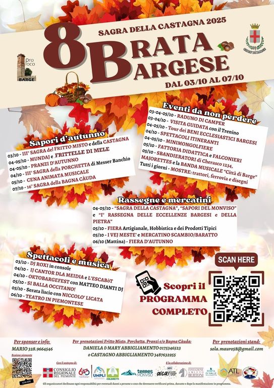 Rassegne e Mercatini. Dal 4 al 5 ottobre si svolgeranno: la Sagra della Castagna, Sapoti del Monviso e la 1^Rassegna delle Eccellenze Bargesi e della Pietra, mentre domenica 5 ottobre sarà dedicato alla Fiera Artigianale, Hobbistica e dei Prodotti Tipici, ai Vei Meste e al Mercatino Scambio/Baratto.