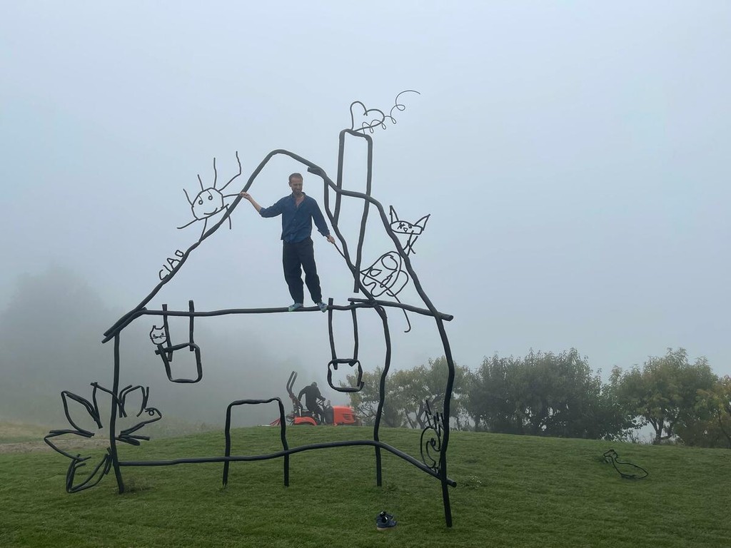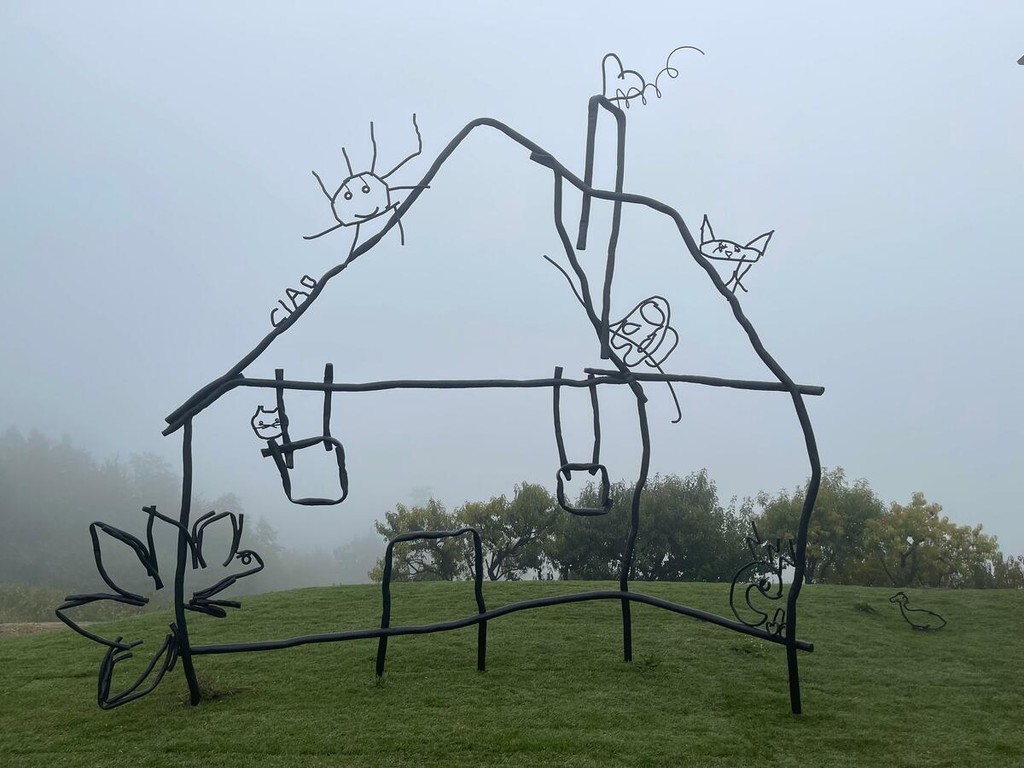 Abetare (un giorno a scuola), 2025. Disegni e scarabocchi dei banchi delle scuole di Dogliani e dei Balcani è la prima opera permanente del progetto Abetare, da cui trae il titolo, una serie di opere che Halilaj porta avanti dal 2015, e dà forma alla casa stilizzata incisa su un banco da una bambina o da un bambino di una scuola di Dogliani. L’artista ha assemblato tubi di acciaio piegati e ritorti per riprodurre fedelmente il disegno, rendendo uno scarabocchio fugace un’opera scultorea e permanente. Come racconta il titolo, Halilaj ha dato vita a una nuova scuola immaginaria, popolata da creature, scritte e simboli provenienti sia dai banchi delle Langhe sia dei Balcani. L’opera è un crocevia di segni e figure di diverse aree geografiche, un incontro che diventa una celebrazione gioiosa dell’immaginazione e della fantasia, della libertà e del gioco di bambine e bambini di ogni luogo e di ogni tempo.