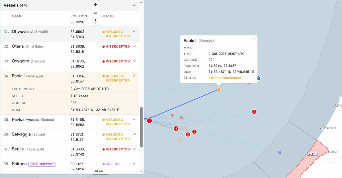 Mancano anche notizie in merito al luogo in cui sarebbero state condotte le navi intercettate: nei giorni scorsi è stato citato Ashdod, mentre il ministero degli Esteri israeliano parla genericamente di un porto internazionale, affermando che le persone trattenute siano sane e salve, e annunciandone l’espulsione nei rispettivi paesi con tempistiche ancora da definire.