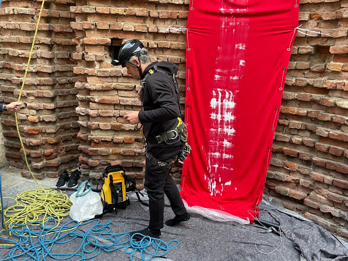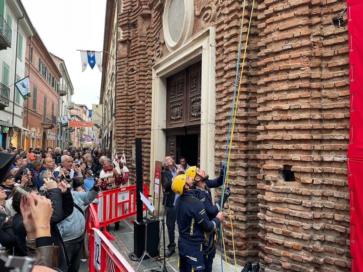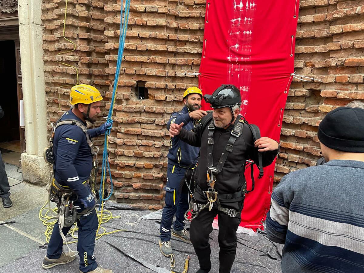 Tutti col naso all’insù e col fiato sospeso gli spettatori albesi e turisti da ogni dove assiepatisi a seguire l’evoluzione della rocambolesca performance con la quale ieri, sabato 4 ottobre, alle 17.30 il pittore del Palio degli Asini 2025, l’artista albese Enzo Mastrangelo, mattone dopo mattone, si è arrampicato sulla facciata della chiesa barocca della Maddalena di Alba per stendere con un grande pennello la sua bianca “linea del tempo”.