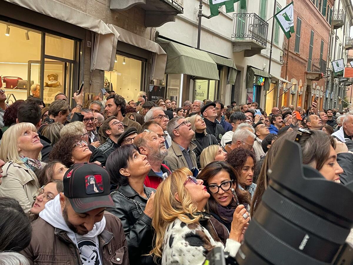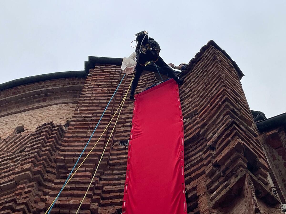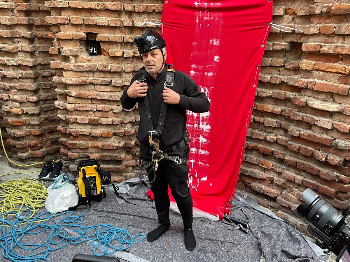 Tutti col naso all’insù e col fiato sospeso gli spettatori albesi e turisti da ogni dove assiepatisi a seguire l’evoluzione della rocambolesca performance con la quale ieri, sabato 4 ottobre, alle 17.30 il pittore del Palio degli Asini 2025, l’artista albese Enzo Mastrangelo, mattone dopo mattone, si è arrampicato sulla facciata della chiesa barocca della Maddalena di Alba per stendere con un grande pennello la sua bianca “linea del tempo”.