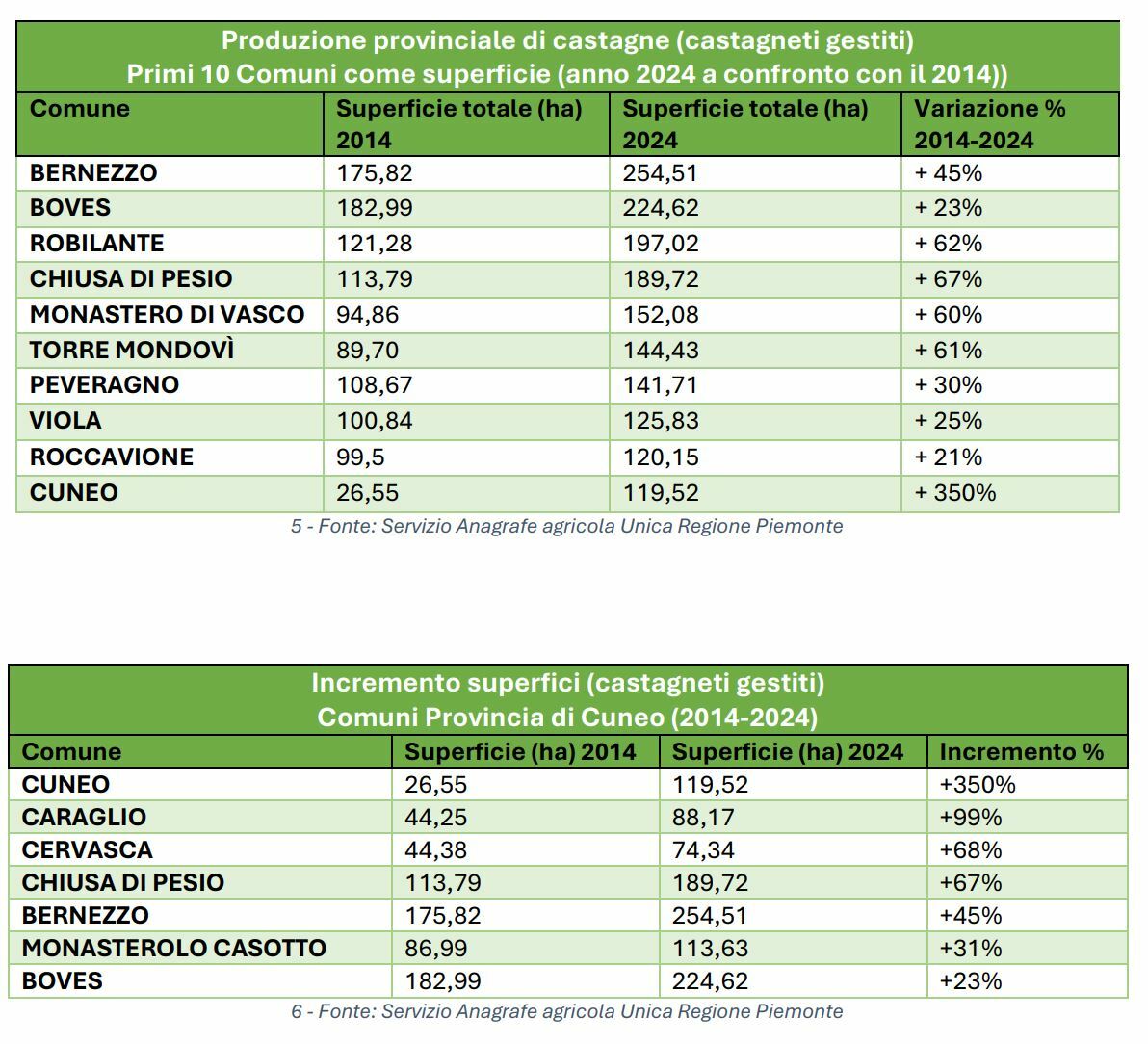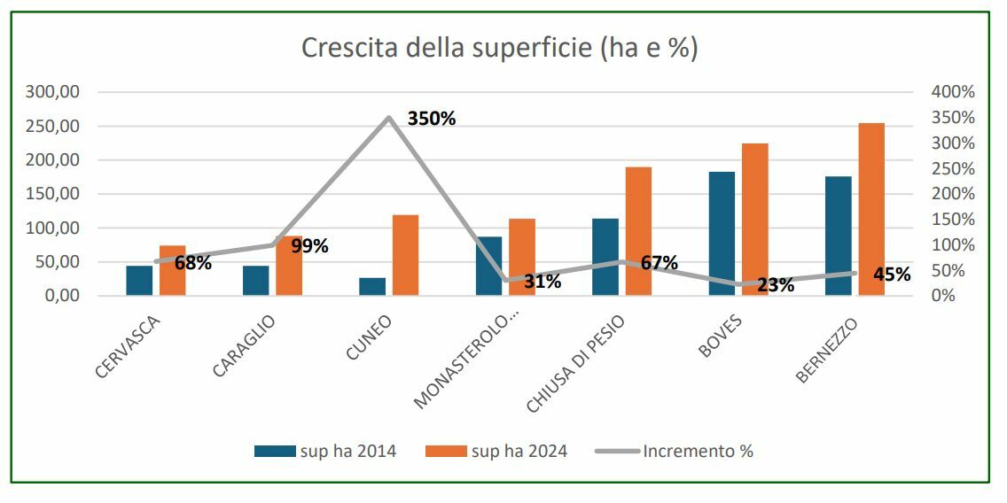Negli ultimi dieci anni si registra uno spostamento significativo verso aree pedemontane e collinari, più facilmente meccanizzabili. I dati dell'Anagrafe Agricola evidenziano incrementi notevoli: Cuneo (+350%), Caraglio (+99%), Cervasca (+68%), Chiusa di Pesio (+67%), Bernezzo (+45%) e Boves (+23%).