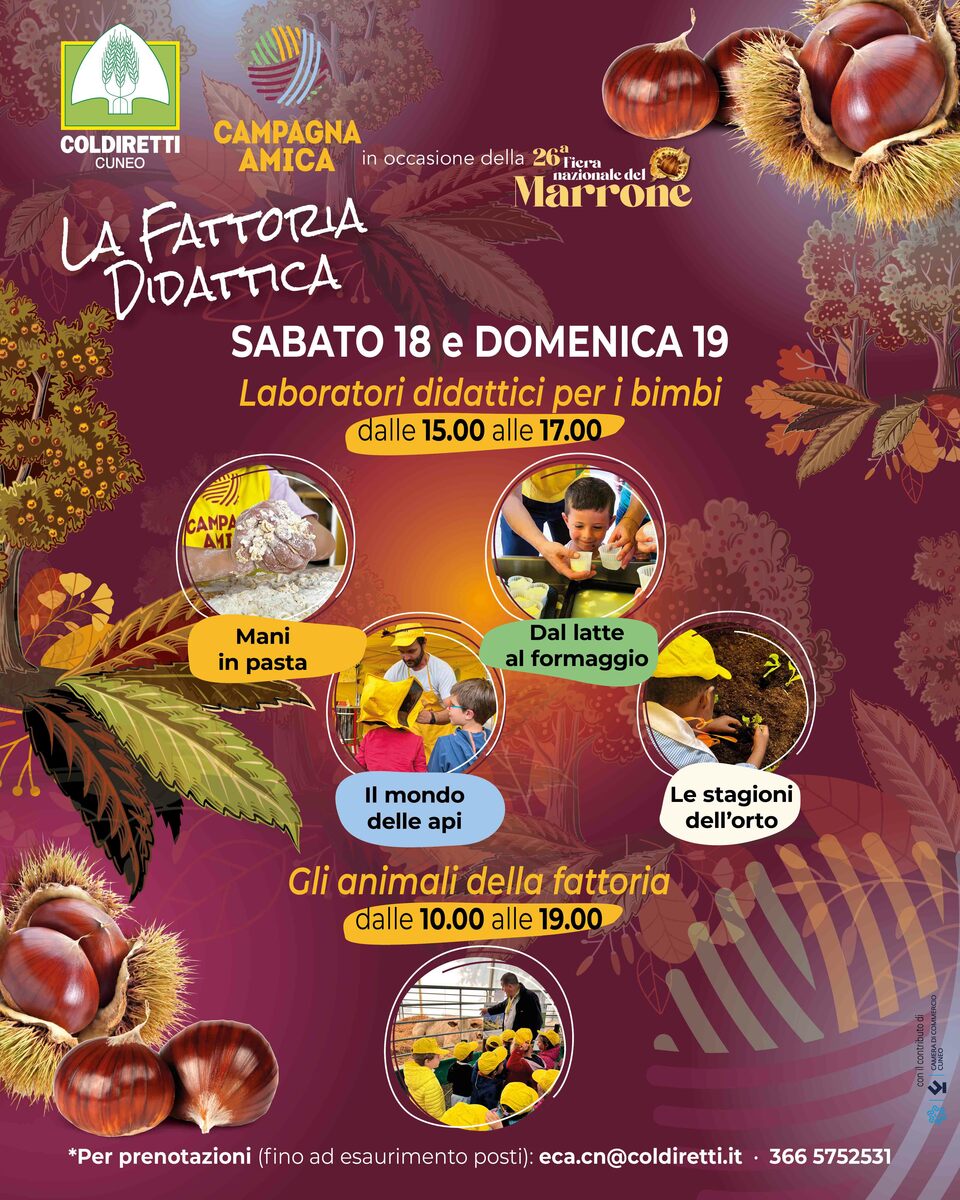 Migliaia di bambini sono attesi a Cuneo di venerdì 17 a domenica 19 ottobre in occasione della 26ª Fiera nazionale del Marrone per visitare la Fattoria degli animali e partecipare ai laboratori didattici di Coldiretti Campagna Amica ai Giardini Fresia.