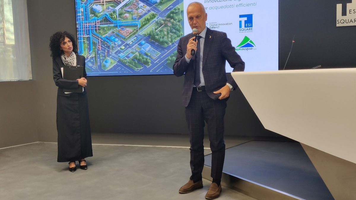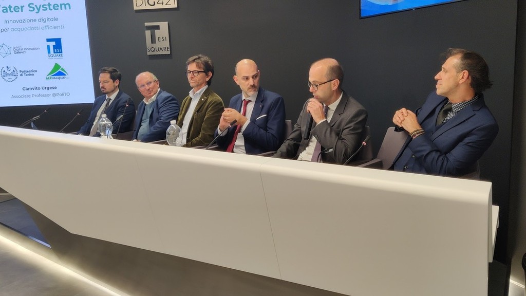 Ad illustrare il progetto Giuseppe Pacotto, CEO di Tesisquare, Simone Mauro, Presidente di Alpi Acque, Gianvito Urgese, Politecnico di Torino, Claudio Careglio, Direttore di Alpi Acque, Andrea Dovetta, del servizio acquedotto Alpi Acque, Davide Sannazzaro, sindaco di Cavallermaggiore, Alberto Deninotti, sindaco di Marene.