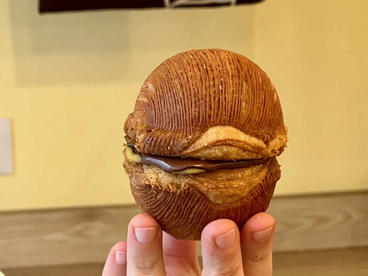 Certo, quando vedrete le dimensioni piuttosto consistenti di questa particolare viennoiserie, qualche dubbio immediatamente vi verrà. Non fidatevi però delle apparenze e, sui piccoli sgabelli che il locale mette a disposizione o nel bar vicino se vorrete accompagnarli con un caffè, assaggiateli con calma. Scoprirete profumi e sapori che vi faranno ritornare. Ma, viste le code che si formano soprattutto il sabato e la domenica, preparatevi a non essere i soli.