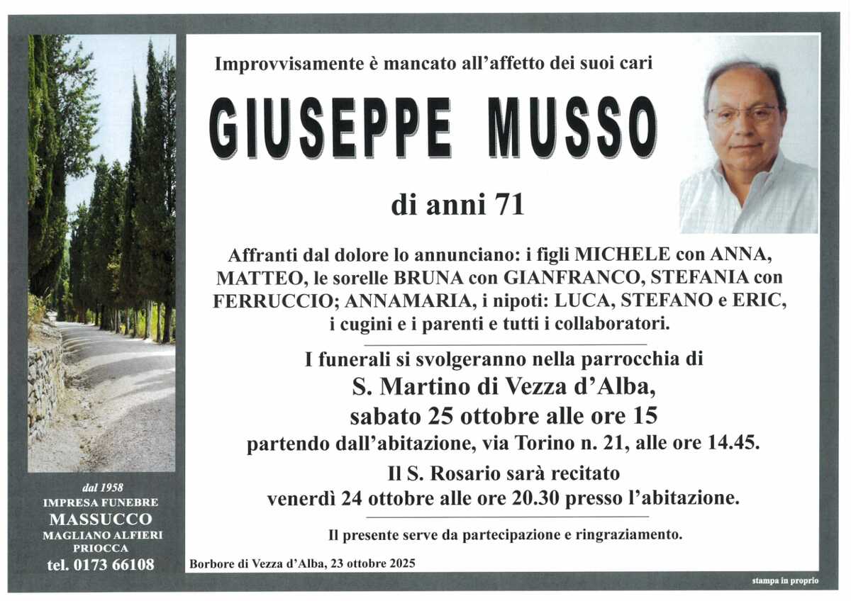 Giuseppe Musso lascia i figli Michele con Anna, e Matteo, le sorelle Annamaria, Bruna con Gianfranco, Stefania con Ferruccio, nipoti, parenti e collaboratori.