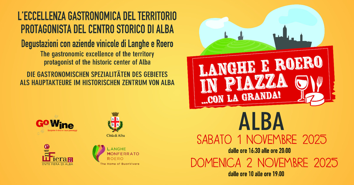 L’Associazione Go Wine, d’intesa con l’Ente Fiera Internazionale del Tartufo Bianco d’Alba, promuove ad Alba l’evento Langhe e Roero in Piazza… con la Granda, giunto quest’anno alla XXIV^ edizione. Sabato 1 e domenica 2 novembre, in piazza Risorgimento, saranno protagonisti i prodotti esclusivi o particolarmente legati alla tipicità del territorio di Langhe e Roero, assieme ad altre eccellenze enogastronomiche della provincia Granda.