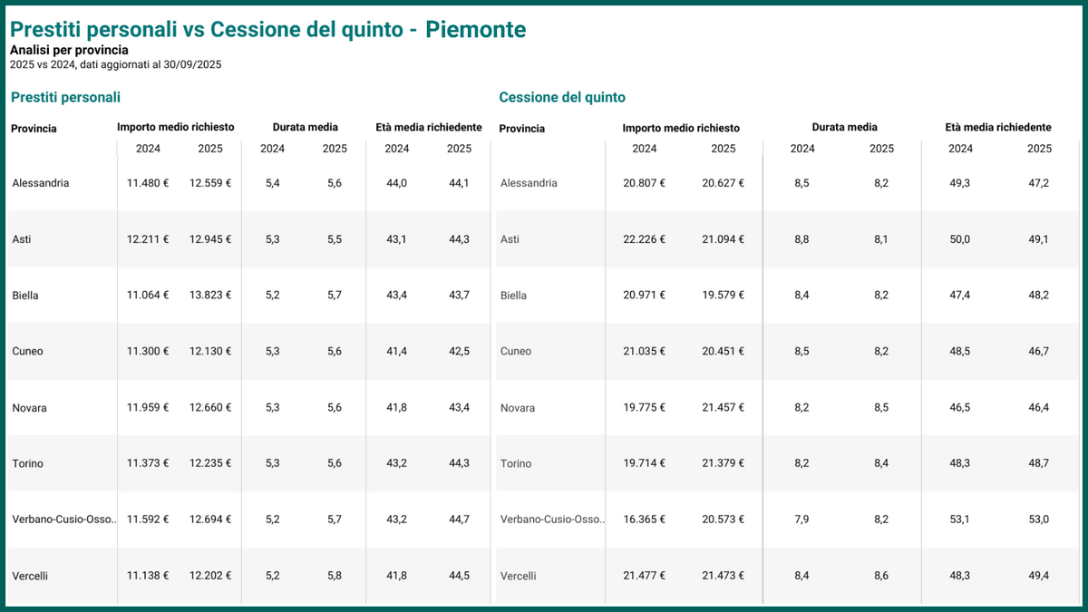 Vercelli si distingue per l’importo medio richiesto più elevato del Piemonte per le cessioni del quinto, da 21.477 € nel 2024 a 21.473 € nel 2025, e nella medesima provincia si registra anche la durata dei finanziamenti più lunga dell’intera regione, con un dato medio di 8 anni e 7 mesi. Per quanto riguarda l’età dei richiedenti, nella provincia di Verbano-Cusio-Ossola si registra il valore più elevato, con 53 anni in media, dato in calo rispetto al 2024 quando era pari a 53 anni e 2 mesi.