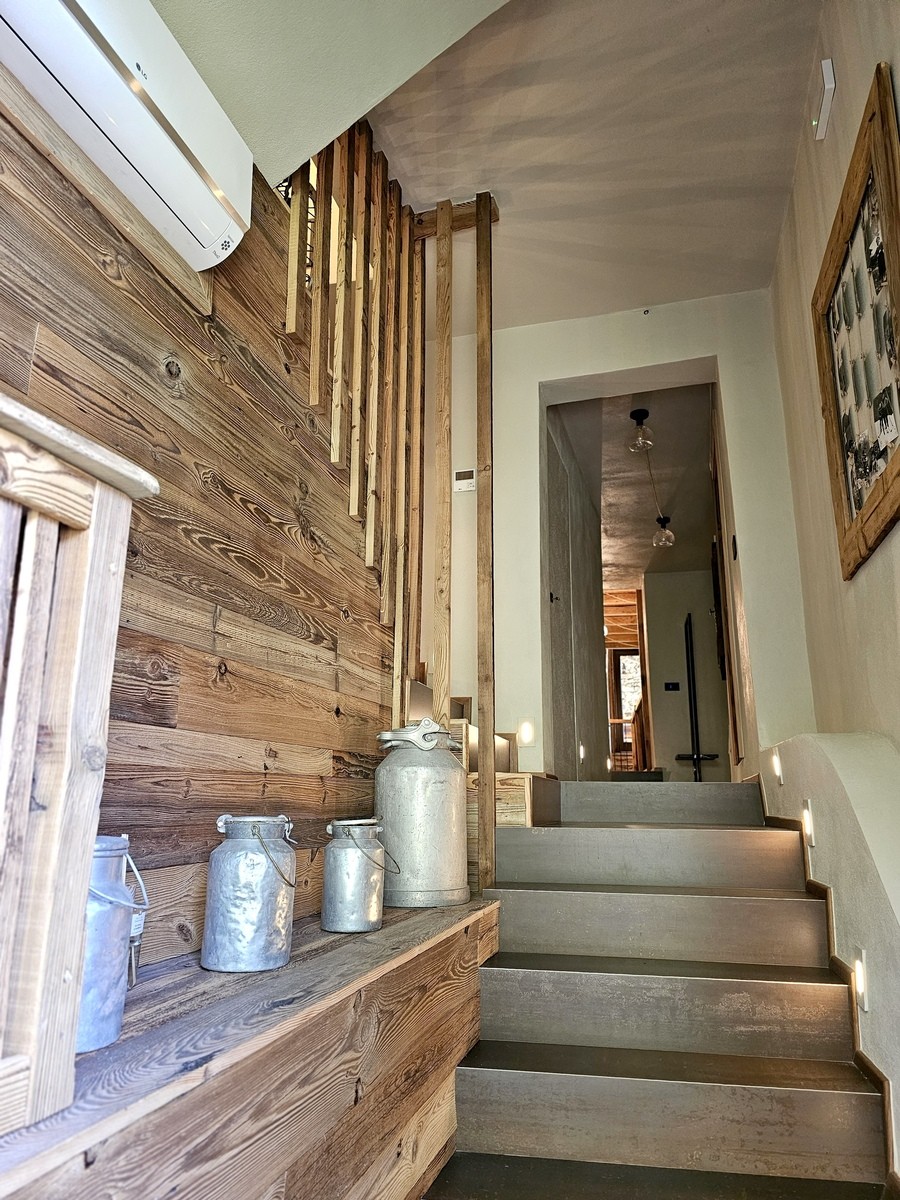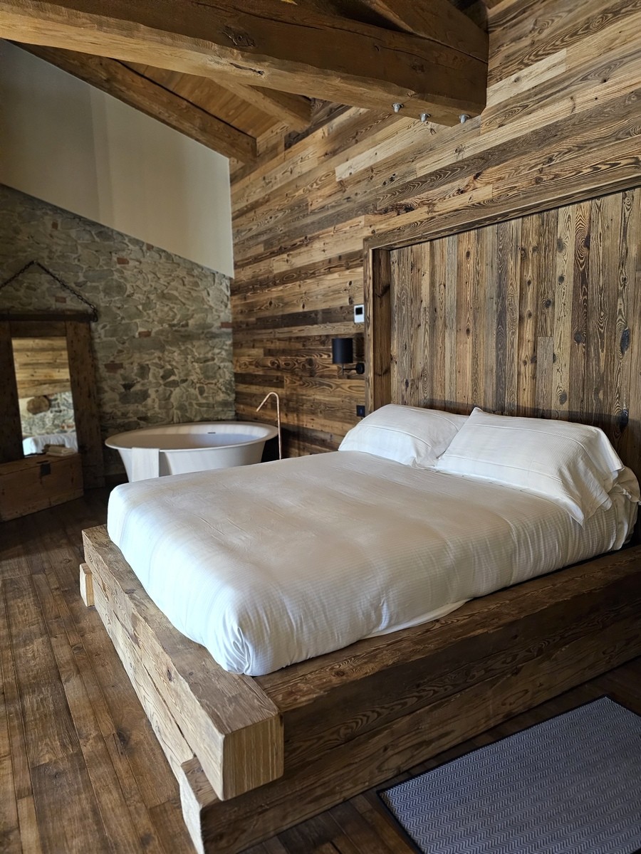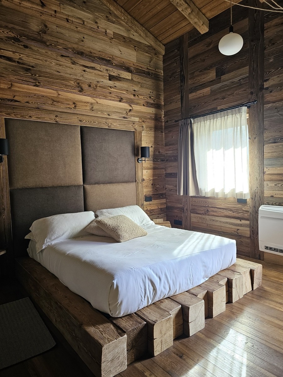 All’interno, il legno è il filo conduttore: pavimenti chiari, travi a vista, muri di pietra recuperata e camere accoglienti, ognuna con un piccolo dettaglio che racconta la montagna e un anno di nascita sulla porta, per ricordare tutti gli abitanti di questa grande casa.