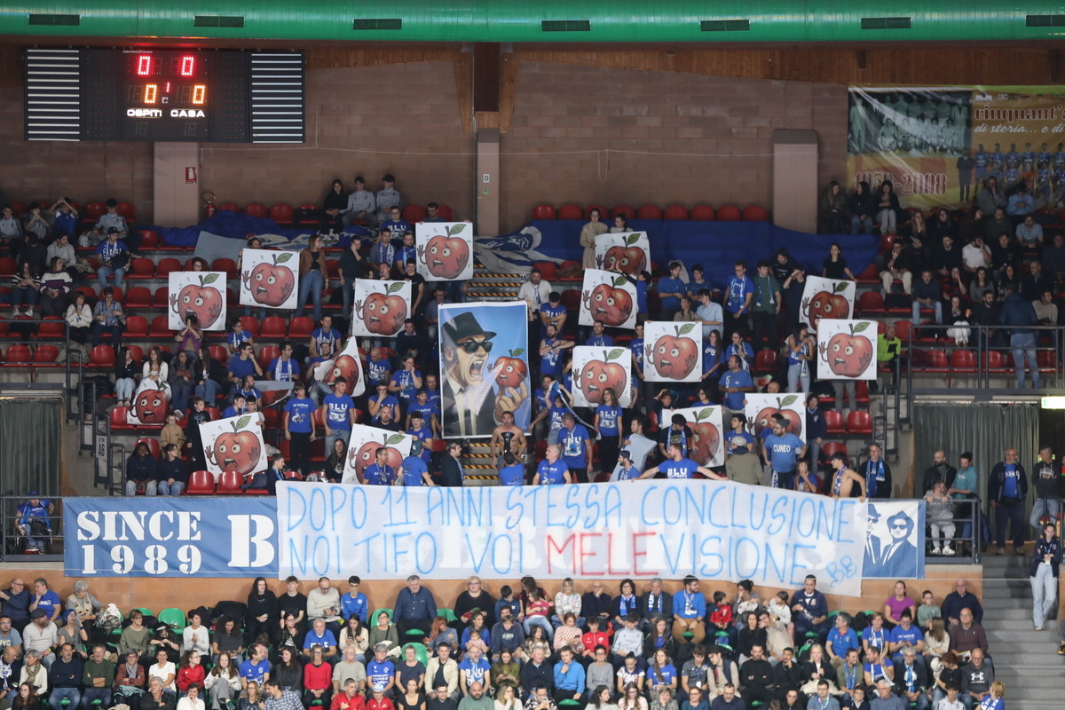 Oltre quattromila spettatori hanno riempito il palasport di San Rocco Castagnaretta per una sfida dal sapore speciale: Cuneo-Trento, la classicissima che tornava in Piemonte dopo undici anni. L’atmosfera è quella delle grandi occasioni, con lo striscione dei Blu Brothers a colorare la curva: “Dopo 11 anni stessa conclusione, noi tifo voi Mele visione”.