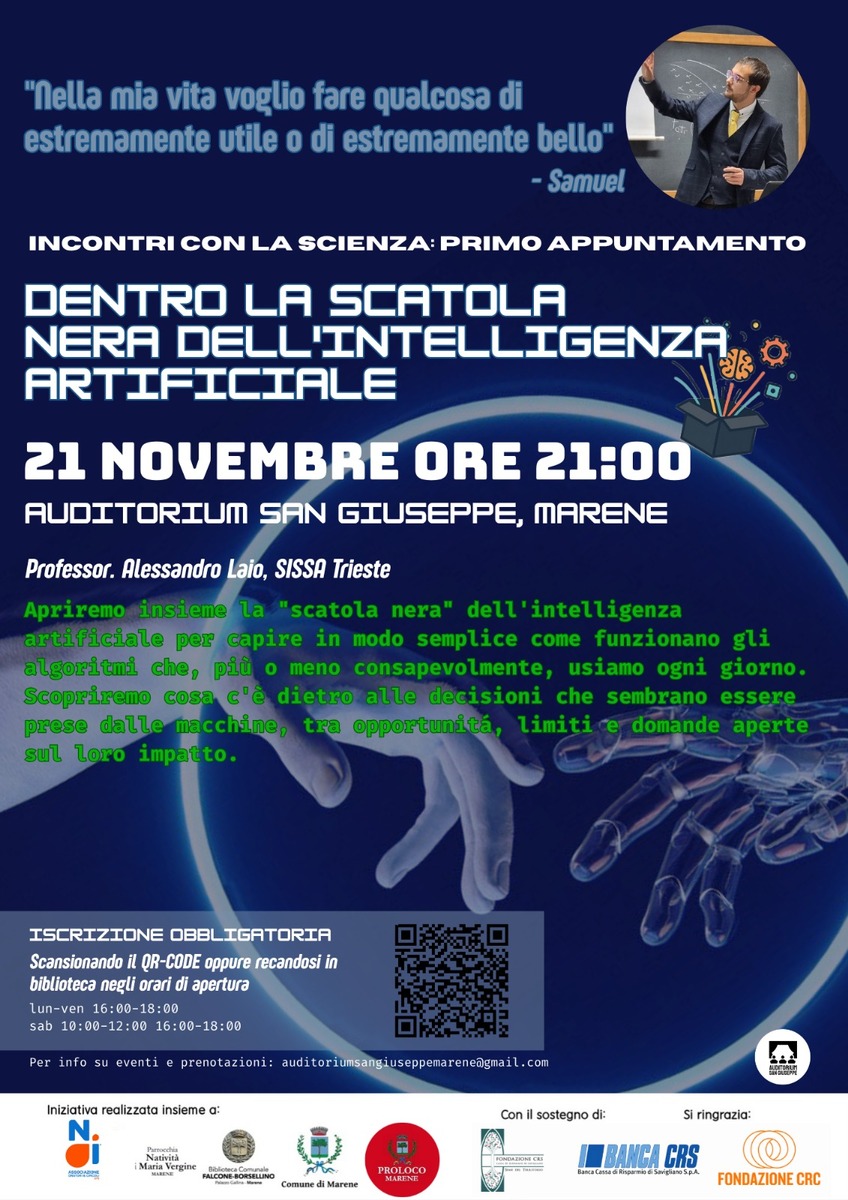Si tratterà di un evento decisamente particolare e riteniamo possa essere interessante per le persone di tutte le età, per cui l’invito è quello di partecipare numerosi venerdì 21 novembre alle ore 21 presso l’Auditorium San Giuseppe (Oratorio di Marene); si potrà prenotare il proprio posto attraverso il sito web dell’Auditorium (https://parrocchiamarene.it/auditorium), recandosi in Biblioteca di Marene durante l’orario di apertura oppure al link https://www.eventbrite.com/e/biglietti-dentro-la-scatola-nera-dellintelligenza-artificiale-1778552130299.