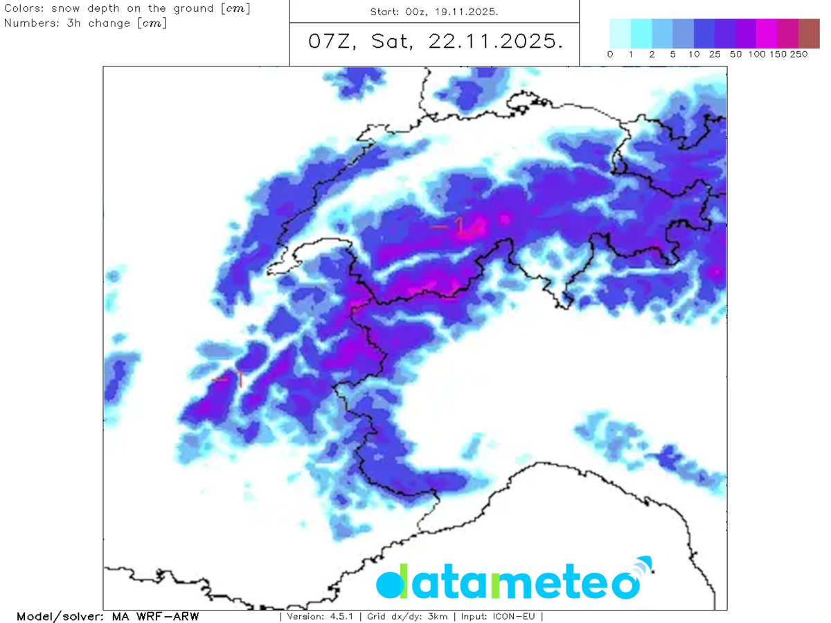 Nella mappa la neve presente al suolo prevista entro la mattina di sabato 22 novembre.