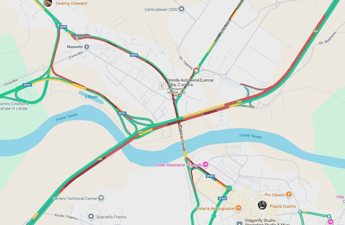 Il risultato è quello che ogni albese può facilmente immaginarsi e che nell’immagine sotto viene ben rappresentato dal servizio dedicato di Google, con code dalle due provenienze sulla tangenziale, sulla Strada Statale 231 arrivando da Bra, in corso Canale arrivando da Mussotto e in corso Asti arrivando da Vaccheria.