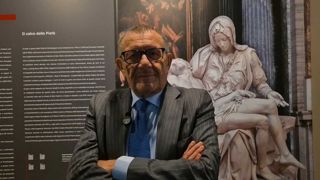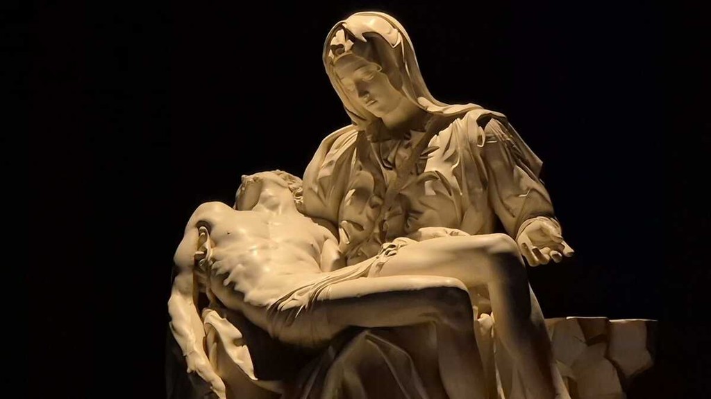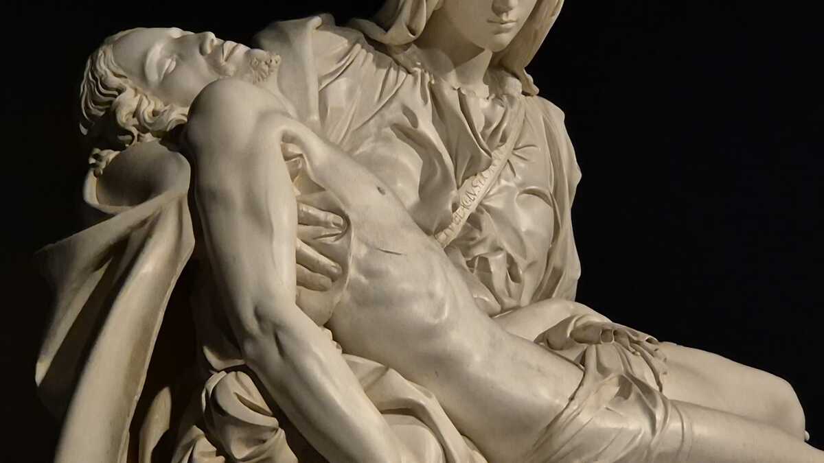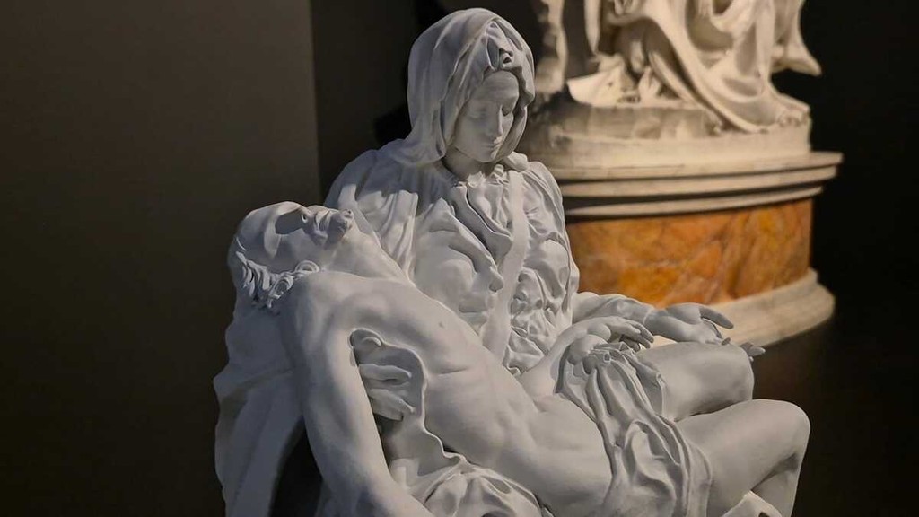 Disposta nelle sale espositive di via Cavour 4, l’opera accoglie il pubblico attraverso un percorso che permette di osservare da vicino ogni dettaglio: dal gesto delle mani alla resa del panneggio, fino alla tensione silenziosa che lega il corpo del Cristo alla figura della Madre. Una vicinanza impossibile da vivere davanti all’originale, anche perché custodito nella Basilica di San Pietro dietro una protezione in vetro.