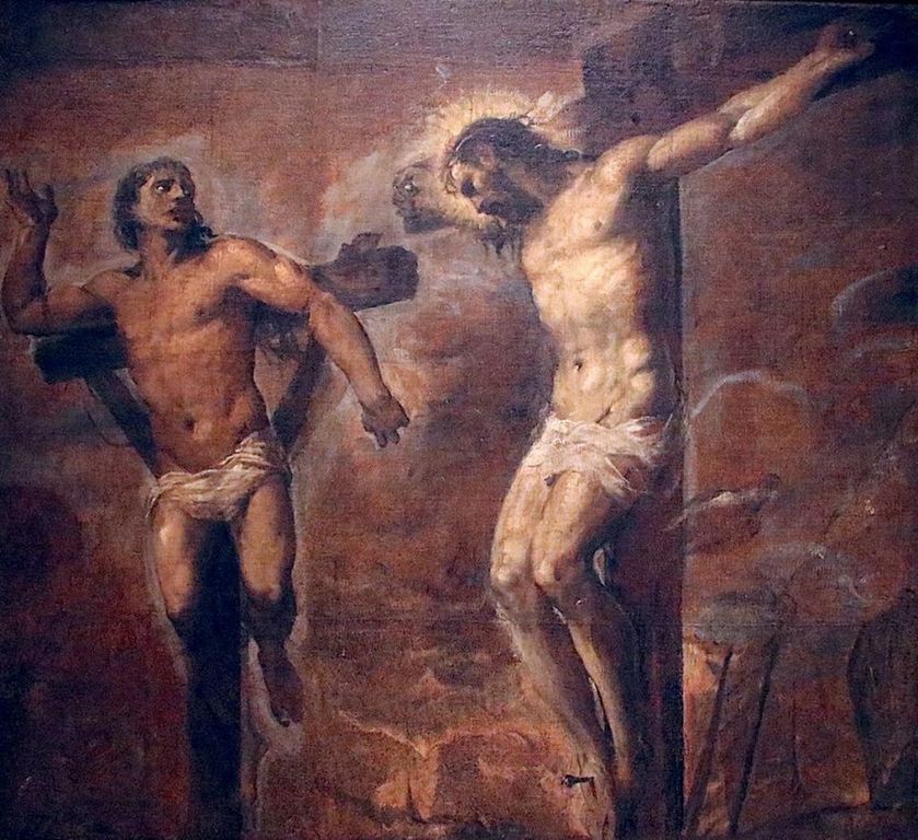 Solo uno dei ladroni lo riconosce come il sovrano che sta entrando nella sua gloria e gli si rivolge chiamandolo per nome: «Gesù, ricordati di me quando sarai nel tuo regno». A questo punto risuona la potente frase di Gesù che dona salvezza persino dalla sua posizione di immobilità e di umana impotenza: «In verità io ti dico: oggi sarai con me nel paradiso».