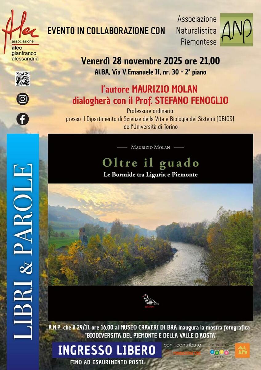 Venerdì 28 novembre alle ore 21, presso l’associazione Alec, via Vittorio Emanuele II, 30 ad Alba, sarà presentato il libro 'Oltre il guado. Le Bormide tra Liguria e Piemonte' di Maurizio Molan. L’autore dialogherà con Stefano Fenoglio, professore ordinario del Dipartimento di Scienze della Vita e Biologia dei Sistemi dell’Università di Torino.
