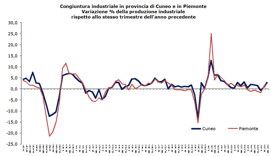 Nel terzo trimestre dell'anno la produzione industriale cuneese cresce del +3,0% rispetto all’analogo periodo del 2024. La provincia di Cuneo, con Torino e Novara, registra una delle migliori performance tra le province piemontesi e superiore alla media regionale (2,5%) mostrando, nel periodo in esame, dinamiche molto incoraggianti.