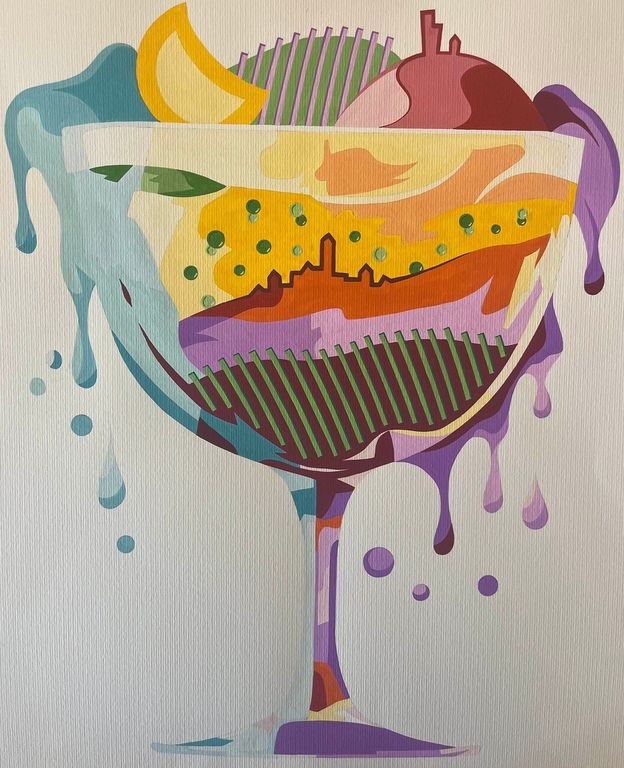 I soggetti rappresentati (bottiglie, calici, parti anatomiche, ecc.) che con le loro linee curve rimandano alle colline del nostro territorio, vengono utilizzati per indagare e sviluppare una ricerca sul tema della Langa fornendone una versione personalizzata, allegra e inedita.