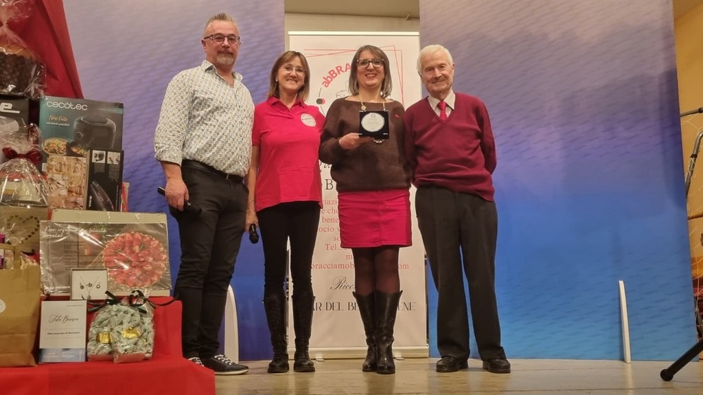 Un riconoscimento è andato anche alla giornalista Silvia Gullino, già abbraccio d’oro nel 2022 e premiata con una targa dal presidente dell’Anioc Cav. Uff. Stefano Milanesio che è anche socio di AbBRAcciAMO per la sua serietà e per il suo impegno culturale verso i braidesi, dando soprattutto voce alle tante associazioni del territorio, attraverso le pagine dei giornali.