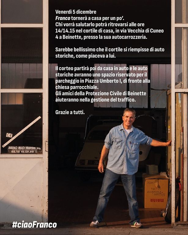 Per ricordare Franco e dare a tutti modo di salutarlo, la famiglia fa sapere che domani, venerdì 5 dicembre, alle 14-14.15 per chi vorrà, nel cortile di casa in via Vecchia Cuneo, sarà possibile ritrovarsi: “Sarebbe bellissimo che il cortile si riempisse di auto storiche, come piaceva a lui”.