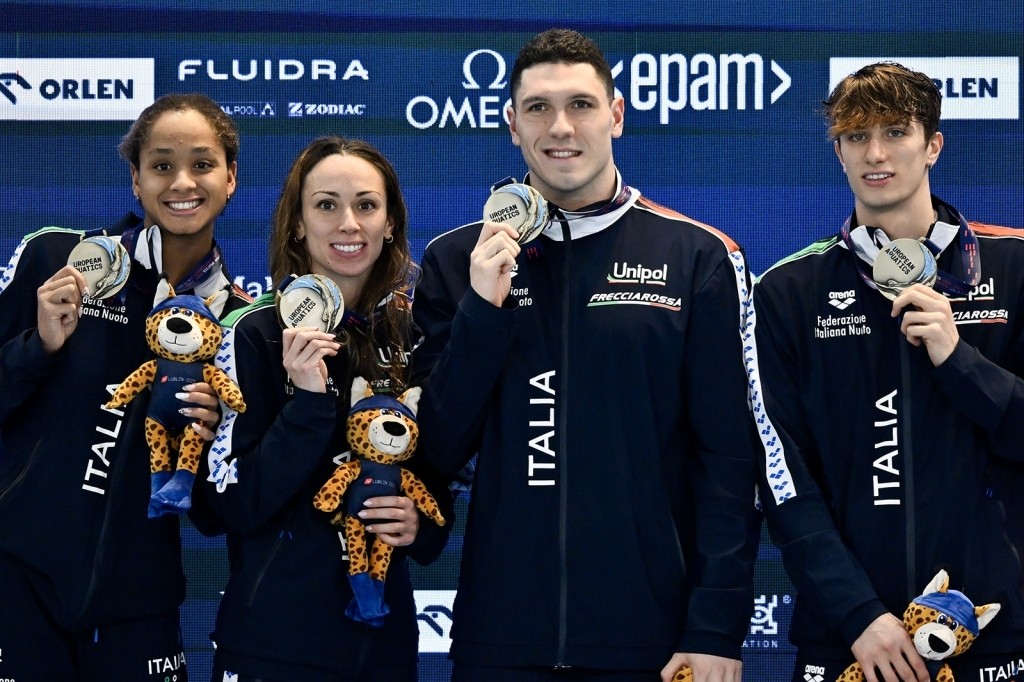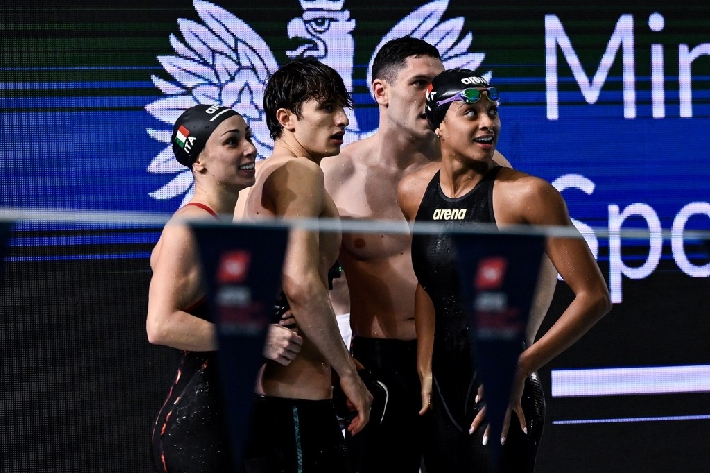 Nella singolare gara a squadre (gareggiano due atleti e altrettante atlete per ogni nazione, a discrezione dei tecnici l’ordine dei sessi) gli azzurri Francesco Lazzari, Simone Cerasuolo, Silvia di Pietro e Sara Curtis hanno fermato il cronometro sul 1’36”09 che è valso loro il primo posto e anche il nuovo record dei campionati. L’argento è andato all’Olanda (1’36”18), sopravanzata dall’Italia solo nel finale grazie all’incredibile ultima frazione della giovane saviglianese; bronzo per la padrona di casa Polonia (1’36”98).