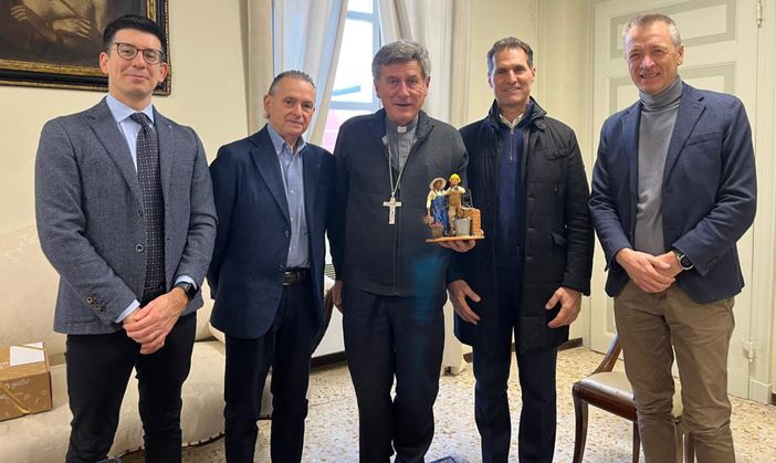 Questa mattina (12 dicembre) Valerio Romana, presidente Confartigianato Zona Cuneo, Joseph Meineri, direttore generale Confartigianato Cuneo, Paolo Quaranta, presidente Coldiretti Zona Cuneo e Massimo Meineri, segretario Coldiretti Zona Cuneo, hanno consegnato la prima statuina al vescovo di Cuneo e Fossano Mons. Piero Delbosco.