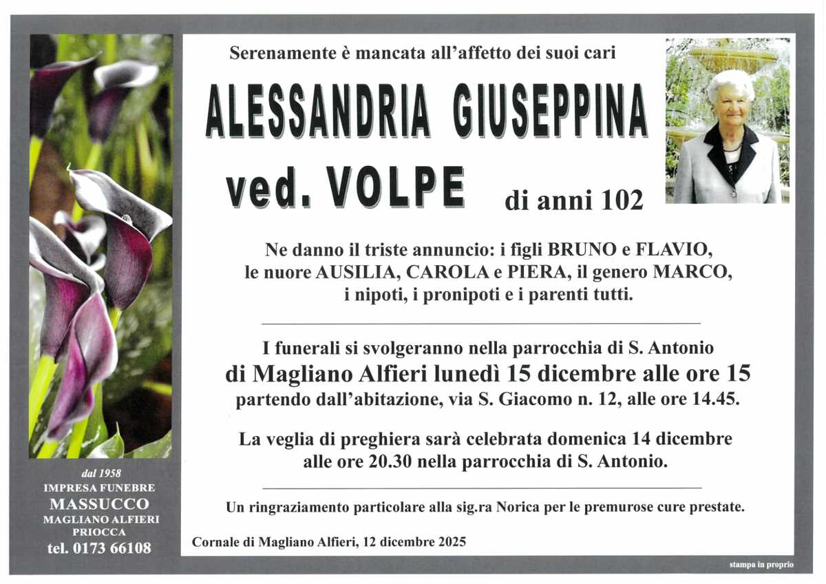 Magliano Alfieri perde la sua figura più longeva. Si è spenta serenamente all’età di 102 anni Giuseppina Alessandria, vedova Volpe, punto di riferimento affettivo e simbolico per la comunità.