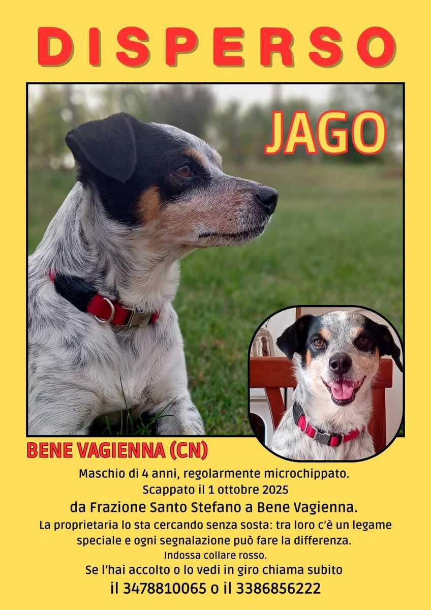 Maschio di 4 anni, regolarmente microchippato, scappato il 1 ottobre 2025 dalla Frazione Santo Stefano di Bene Vagienna. Indossa collare rosso.